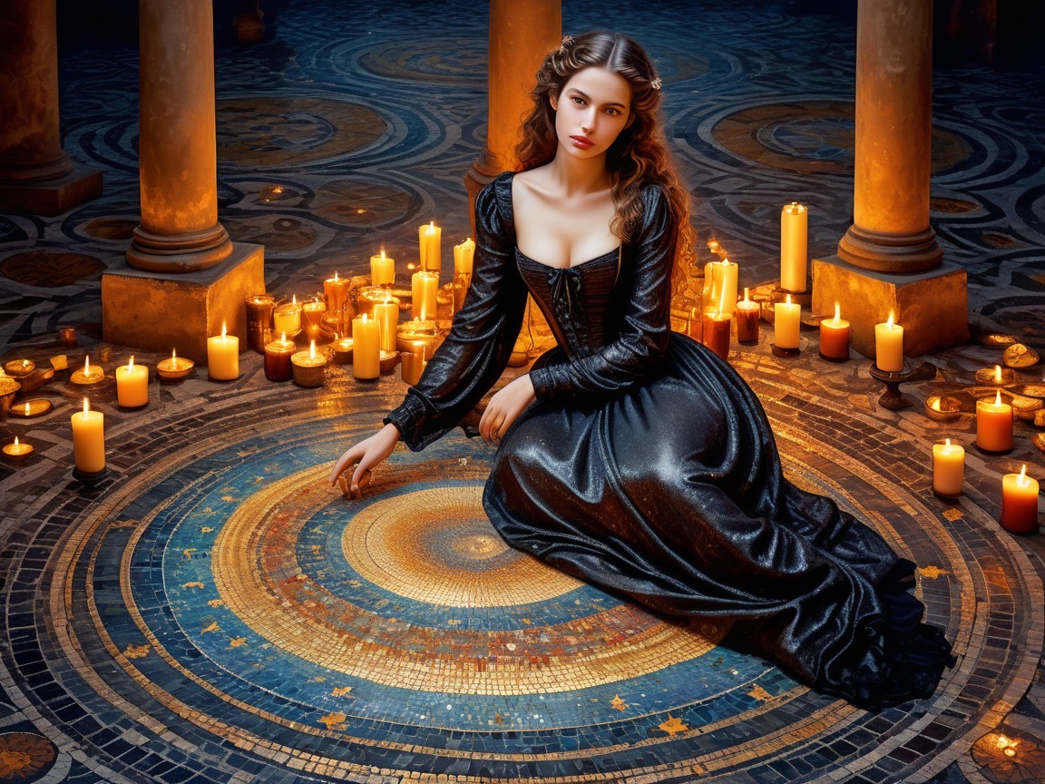 A beautiful woman with long, curly brown hair and a sparkling black gown sits on a mosaic tiled floor surrounded by flickering candles in a dimly lit, ancient hall. Her dark eyes meet the viewer's gaze with a hint of melancholy. Her left hand rests gently on the circular, golden and blue mosaic
