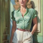 full-length view 40 feet away, beautiful Carmen dell' Orifice/Julie Harris/J.K. Rowling face age 35, painting by Howard David Johnson, tall slender blue-eyed woman with wavy, shoulder-length platinum blonde hair, standing in front of white, paneled doors. She wears a light green, short-sleeved blouse with a slight sheen, buttoned up, revealing a hint of cleavage, and white high-waisted shorts with a brown belt. Her right hand is in her pocket, and she gazes directly at the camera with a confident expression. The lighting is soft, casting gentle shadows.