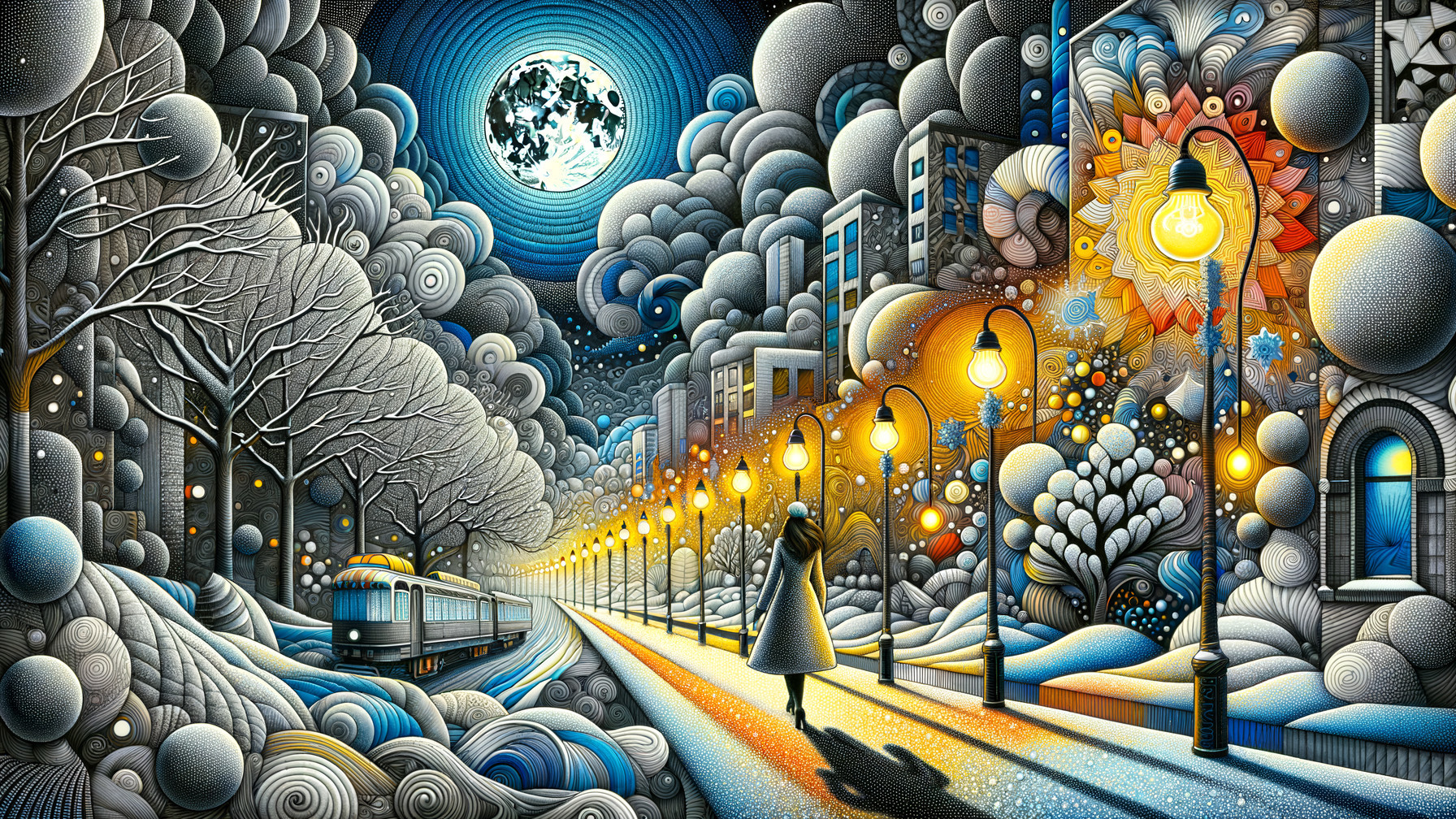 Prompt: "Eclectic by Gustav Klimt, Natalia Goncharova, Van Gogh, Naoto Hattori, Jean-Baptiste Monge, Nicholas Roerich, and Mikhail Vrubel, A woman walking down a surrealistic luminographic winter street decorated with light bulb garlands. In the background, a moon is breaking through the gray clouds with snow in expressive shades. A fusion of Cubism and Pop surrealism. A Metamorphosis of Application with stamping. Charcoal powder contours, embossed trees, zentangle granular patterns, mesmerizing splash winter colours, grey terrain canvas, movement, amazing depth, extraordinary scene, intricate features, exquisite finishing, dreamy masterwork, timeless rennesance, extremely detailed, fantasy, intricate, beautiful, fantastic view, Unreal Engine, chiaroscuro, whimsical, enchanting, Expressive backgrounds, Whimsical lighting"