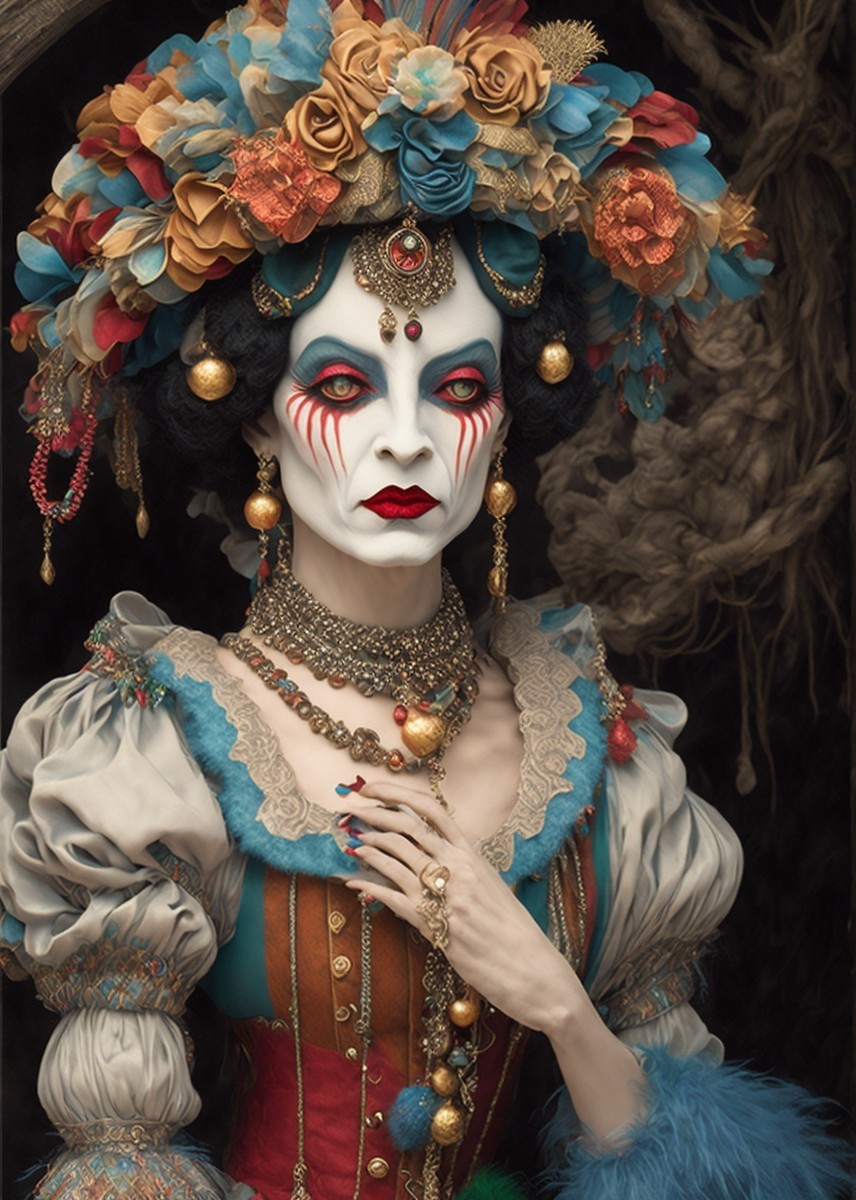 A woman with stylized makeup and a colorful costume, reminiscent of a vintage clown or a court jester, poses expressively.