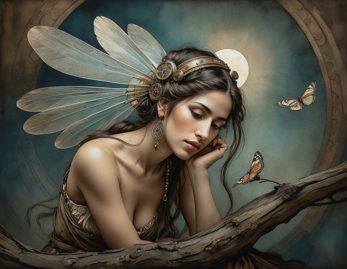 Gypsy shaman. , colored ink drawing, watercolor artwork on old withered paper, vintage, by Caravaggio, Fragonard, Anton Pieck, pale colors, high detail, intricately detailed, hyperdetailed volumetric lighting, art nouveau graphic steampunk ., whimsical, beautiful, poignant, touching. colors sepia tones. soft watercolor extra water in magical realism by Annigoni, Egon Schiele, Milo Manara, Botticelli, Catrin Welz-Stein, Jean Metzinger, Klimt, perfect eyes, perfect handsface, highly detailed, complementary colors, hyper detailed. Watercolor and ink splatter, dynamic pose, dark blue background, unreal engine, alphonse mucha, global illumination, detailed and intricate environment Beautiful woman in the style of Pino Daeni Dorota Piotrowiak Edward Gorey, junji ito, klimnt , gold leaf color, silver leaf color beautiful dynamic lighting high definition hdr * Random prompt award winning Max Ernst ultra detailed 4K 3D Texture