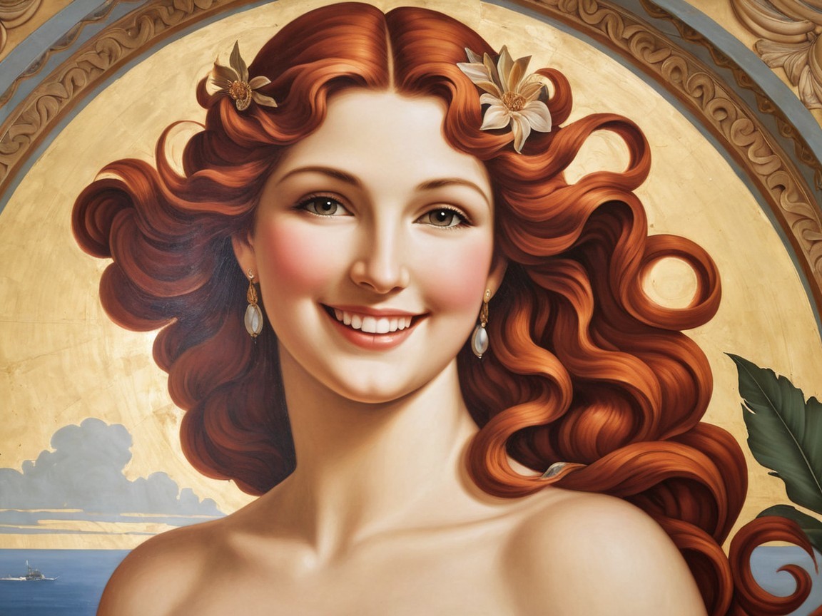 A vibrant mural depicts a smiling woman with long, flowing brown hair adorned with flowers. Her warm expression is set against a serene landscape of mountains and a tranquil sea.