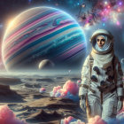 An astronaut stands in a surreal landscape, facing a massive gas giant planet with vibrant rings. Cosmic elements surround them, including distant stars and colorful planets, evoking a sense of wonder.