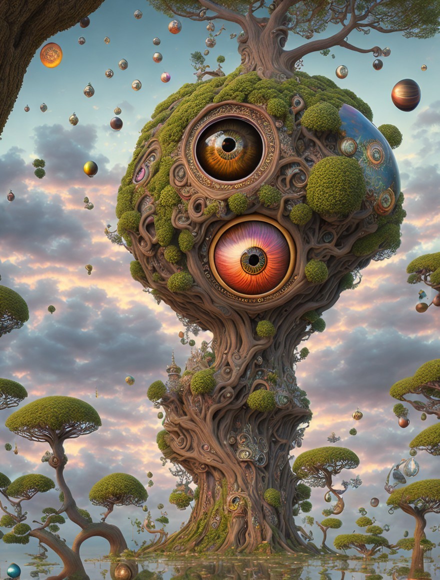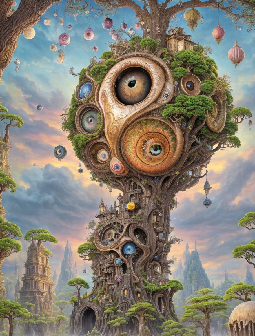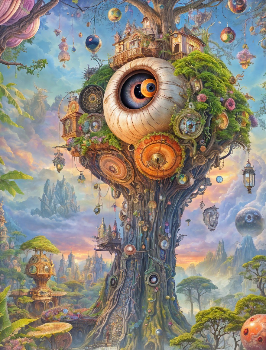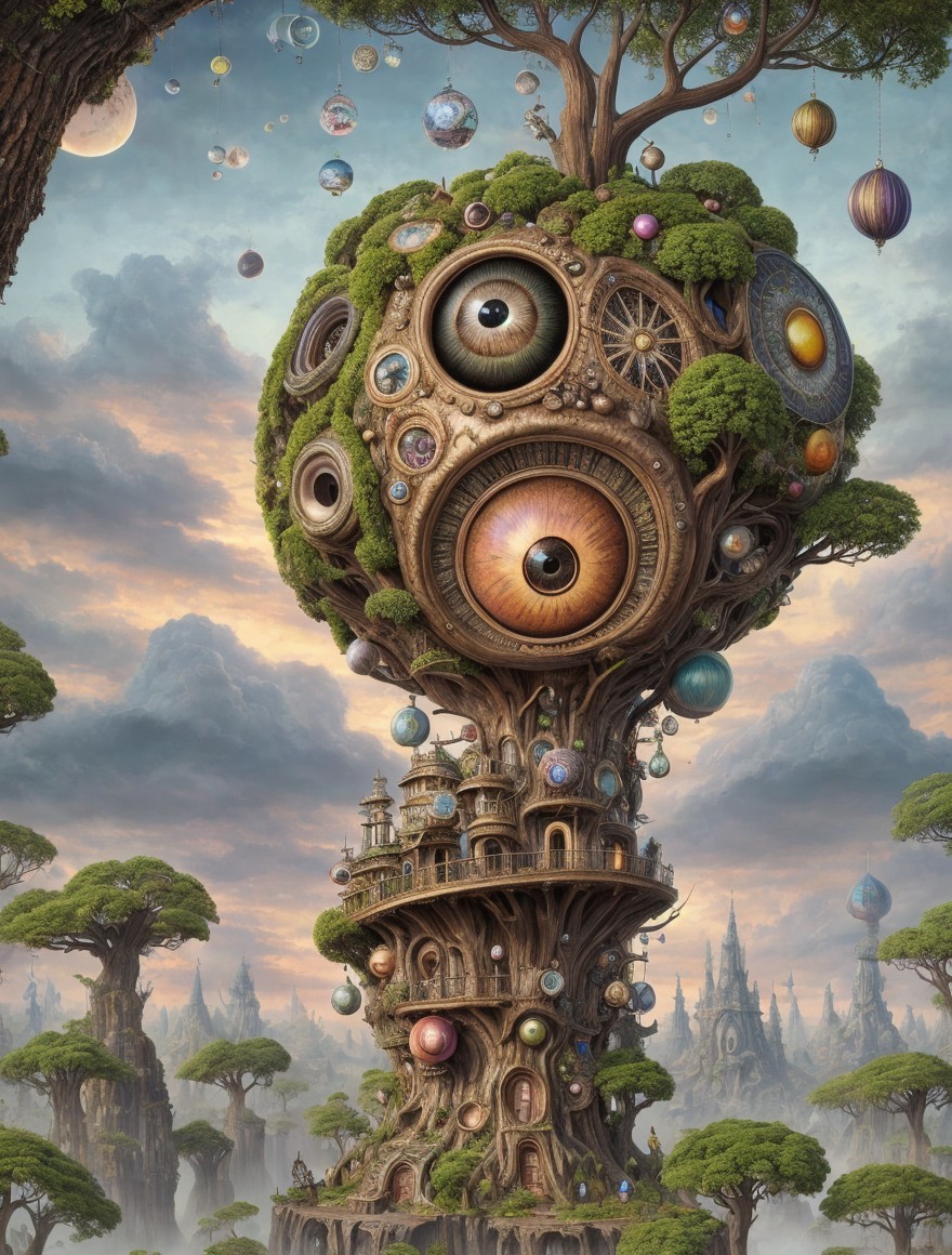 Clockwork tree with colorful orbs and eyes on branches, amidst floating islands and distant castle