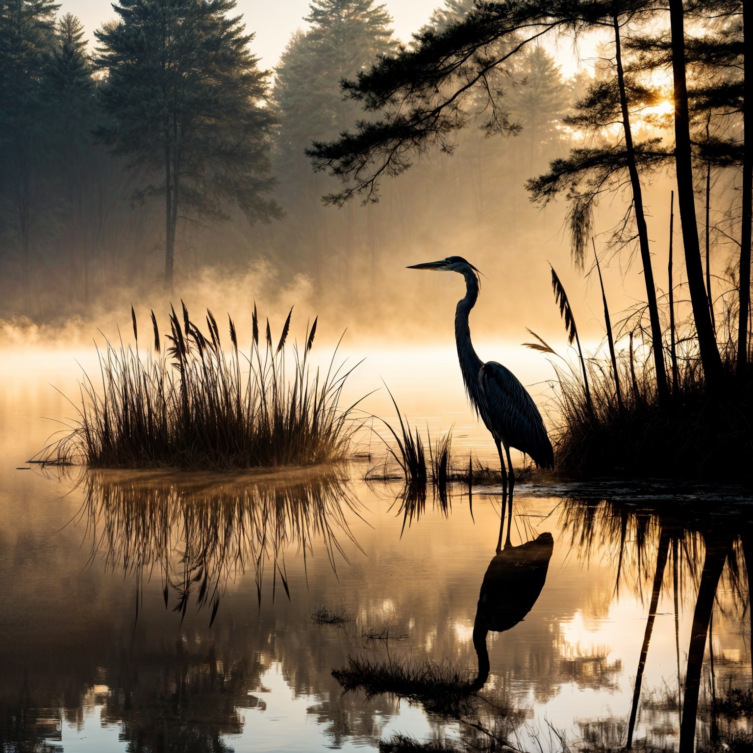 A majestic heron stands gracefully in a misty lake at dawn, its reflection shimmering on the water, surrounded by tall grasses and silhouetted trees in the soft morning light.