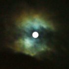 A bright full moon glows amid swirling dark clouds, creating an ethereal halo effect around it. The scene emanates a mystical and serene atmosphere, blending light and shadow.