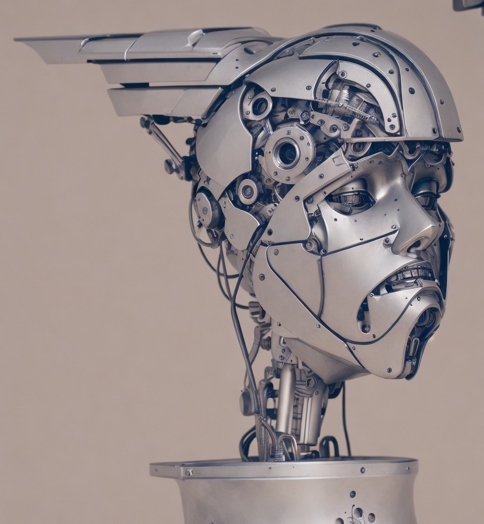 Portrait of a robot with a highly detailed mechanical head, featuring various gears and components, set against a beige background.