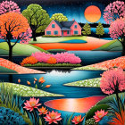 A vibrant landscape featuring colorful hills, a serene lake, and stylized trees. Two moons hang in a starry sky, with birds soaring above and flowers blooming along the water's edge.
