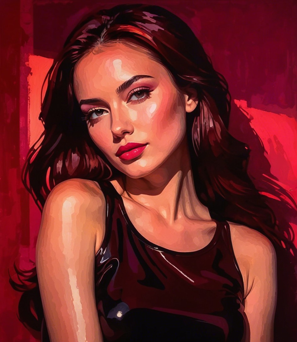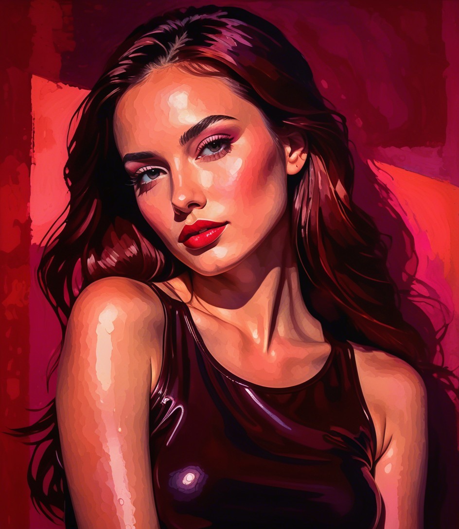 Prompt: Vibrant, expressive, stylized pop-art female portrait, Chiaroscuro. glazing. oily effects. bold and abstract, wet on wet watercolour, halftone textures, dappled illumination, triadic color scheme auburn red rosewood-pink, bathed in soft, ethereal lighting, enhancing the dreamlike atmosphere. The environment is rich with organic shapes and textures, featuring vibrant, round formations in a palette of dark-red, pink, and coral, reminiscent of abstract cymatics. Set against a colored background with rim lighting, featuring erotic abstraction and surrealism, abstract post-avantgarde, dreamy dystopian portraiture, juminocore, stylized flowing hair illusion, subsurface scattering, raytraced shadows, visible textures, bokeh, --ar 1:1 --q 2 --s 750, brightened coloring, warm tones, liminal, luminism, plasticity 1.6, dynamic lighting effects, hues by Brad Kunkle, lighting by Ed Paschke, luscious, anisotropic filtering 1.4, wavery texture patchwork, pellucid details, traumacore elements, grunge aesthetic, fusion art concept, precise Gelsculpt 64K, cel-shaded, ethereal atmosphere. Incorporate warped reflections, luminous elements, fabric textures, and plasticity, dynamic lighting effects,tration,simplistic headshot, precise Gelsculpt 64K rendering, slightly sculpted, ambient occlusion for depth, and hues inspired by Brad Kunkle.The composition includes elements like stencil, catenaries, contoured elegant fusion of Line-art and orphism styles with a touch of sfumato and anime inspiration. The artwork showcases abstract textures created with impasto acrylic techniques, with a color scheme curated by Ed Binkley. The visual presentation incorporates cel-shading techniques by William Bradley, infusing the scene with dynamic and VFX-inspired softened lighting, textured layers, painterly elements, glossy finish, HDR, reflections, rim lighting, parallax occlusion 1.3, angled view showcasing black shaggy hair, seductive expression, matte obsidian eyeshadow, sleek black satin bodysuit, inspired by Roy Lichtenstein and Man Ray, color glitch aesthetics, subsurface scattering 1.2, brightness 1.3, dof, debeh, bokeh, ambient occlusion 1.3, raytraced shadows 1.3, colourful surreal lineage forms, Magical realism, merged styles of John Buscema and Philippe Starck, dyed, beautiful line-art, intricate indiecore details, wavery dappled lighting, zentangle, novelty architecture, stylized chipped patchwork, pastel coloring, shadow mapping 1.3, sensually abstracted, with fluid lines and skin-toned gradients.