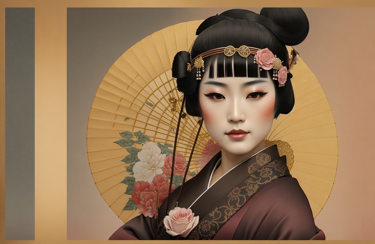 A traditional Japanese geisha holding an open fan, wearing a red kimono, and adorned with intricate hair ornaments.
