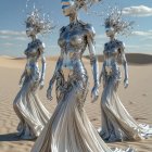The image features three figures in futuristic, shiny silver gowns with striking silhouettes, set against a stark desert landscape with unique rock formations and a clear blue sky.