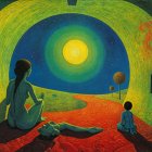 A vibrant cosmic scene featuring swirling waves of color, planets, and a fantastical castle under a radiant sun, blending elements of dreamlike fantasy and outer space.