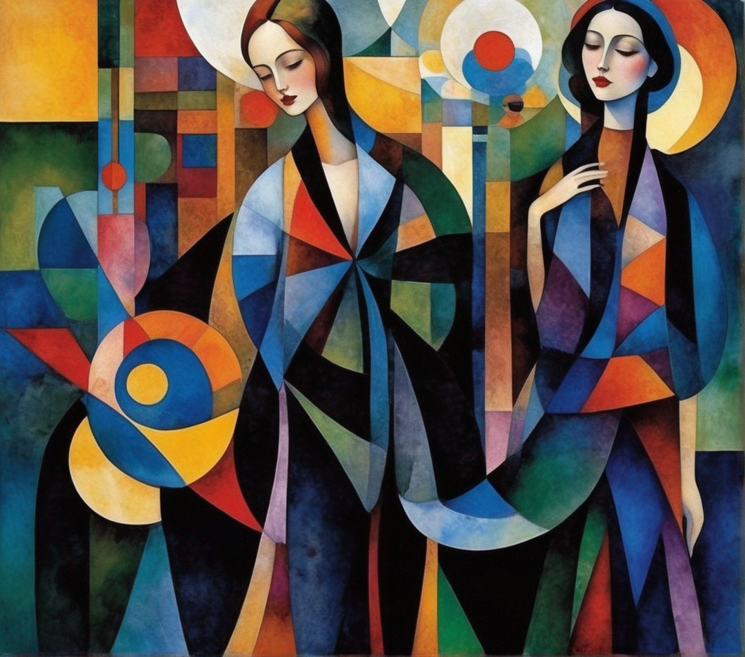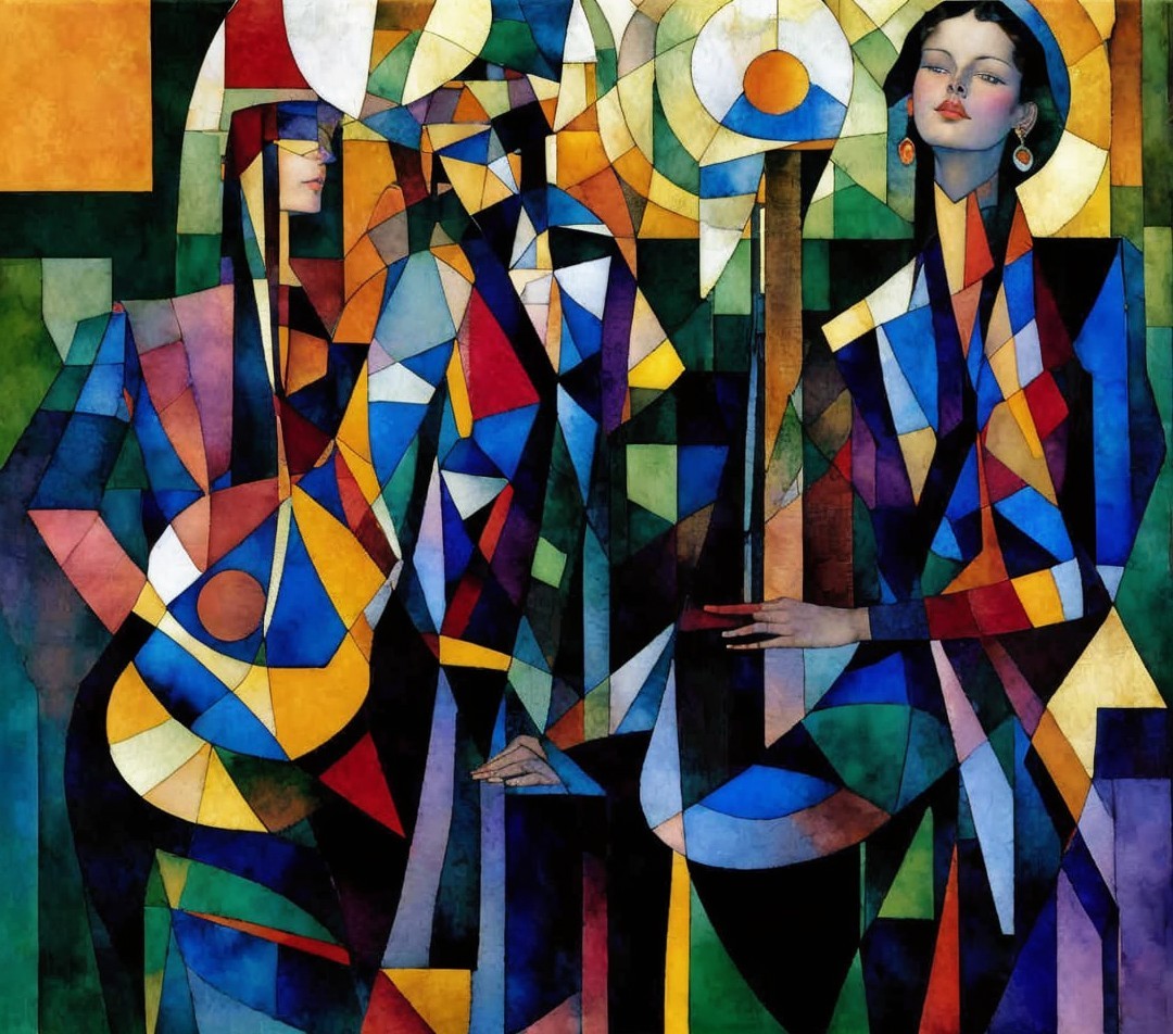 A painting of a woman in a black dress and wide-brimmed hat, sitting by a chair, against a colorful geometric background.