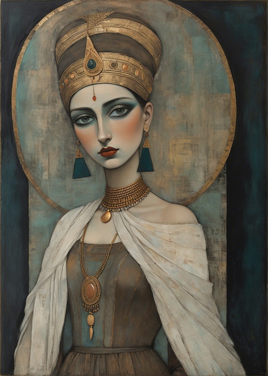 Queen of the Nile. foggy nostalgia, portrait in Burnt umber and soft teal, salmon gold, smoke and mirrors, patina of, battery acid, art brut, moody, somber, desaturated colors, in the style of Paul Klee, Arthur Rackham Dark and moody oil painting of a woman with piercing black eyes, inspired by the works of John Singer Sargent and Edgar Degas, long shot, realistic texture, dramatic lighting, intricate details on clothing and Magical woman fading tones of melancholy and summer nostalgia, soulful portrait, in burnt umber, plutonium, patina of mercury glass, tea stains, art brut, moody, somber, desaturated colors, in the style of Paul Klee, Banksy, Arthur Rackham, based on Prompt by KRW