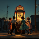 A nostalgic street scene at dusk features four children joyfully interacting with a vintage fortune-telling machine. They are dressed in colorful outfits, surrounded by a charming, quaint neighborhood.