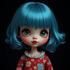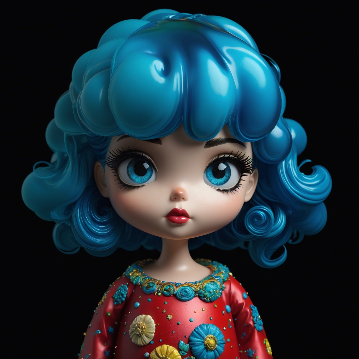 A hyperrealistic shot capturing the upper body of an adorable little doll with beautiful blue hair and a lovely face, standing against a pitch-black background. The doll boasts big, mesmerizing blue eyes with long, wispy lashes and thin eyebrows. She has a tiny nose with rosy cheeks and delicate red lipstick