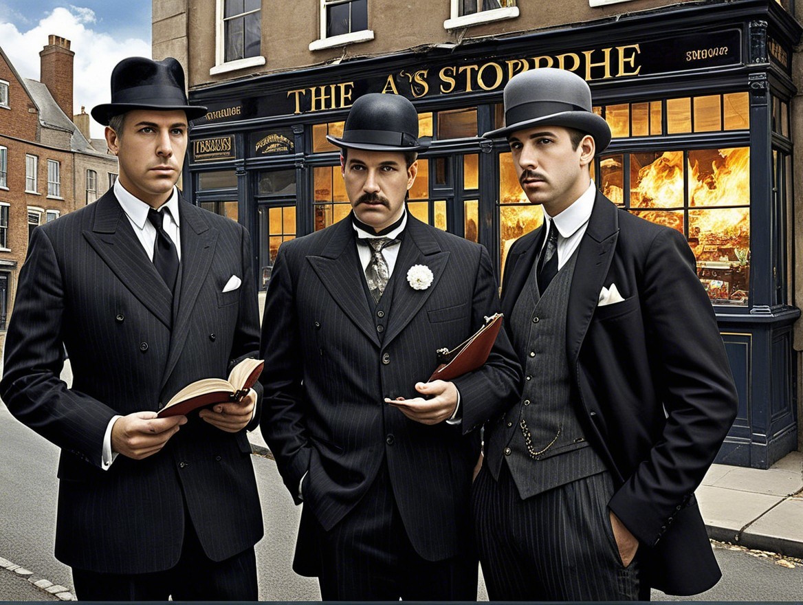 Three men dressed in elegant, vintage suits and top hats stand confidently on the street, holding a book and posing in front of a charming, old-fashioned shop.