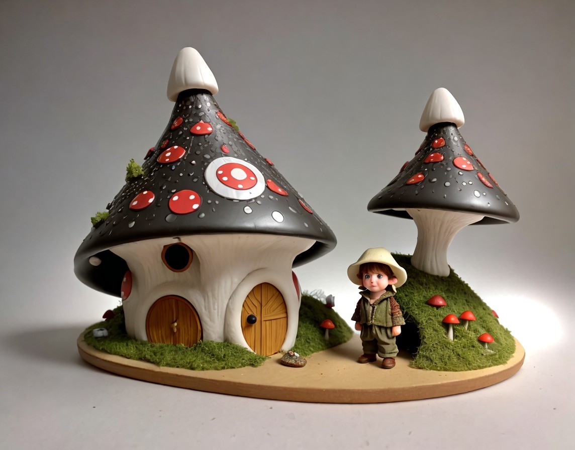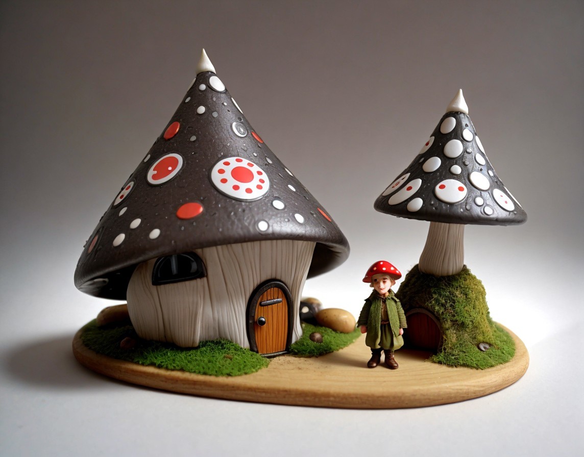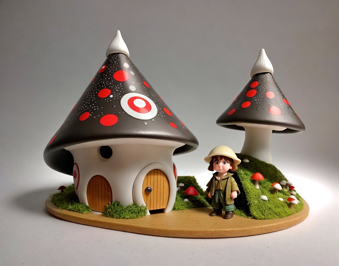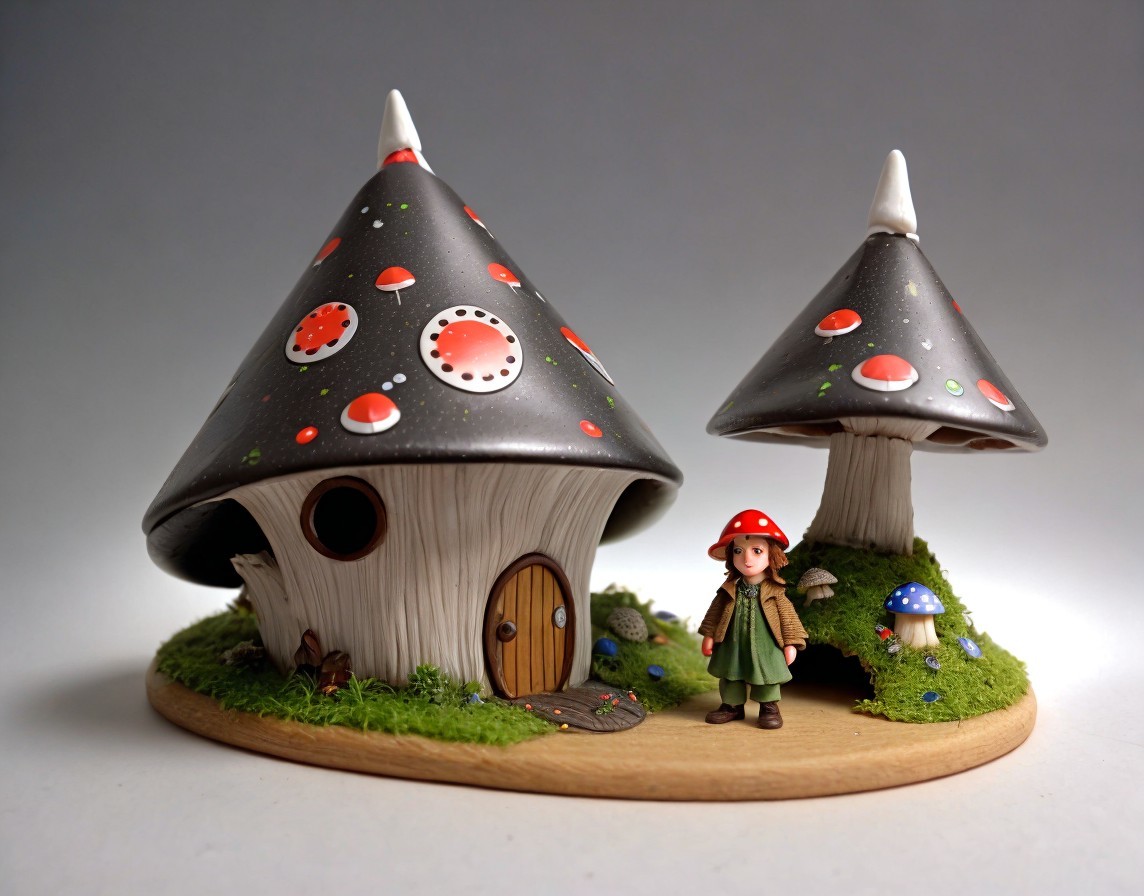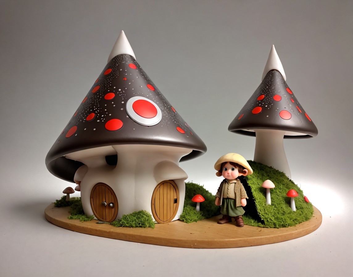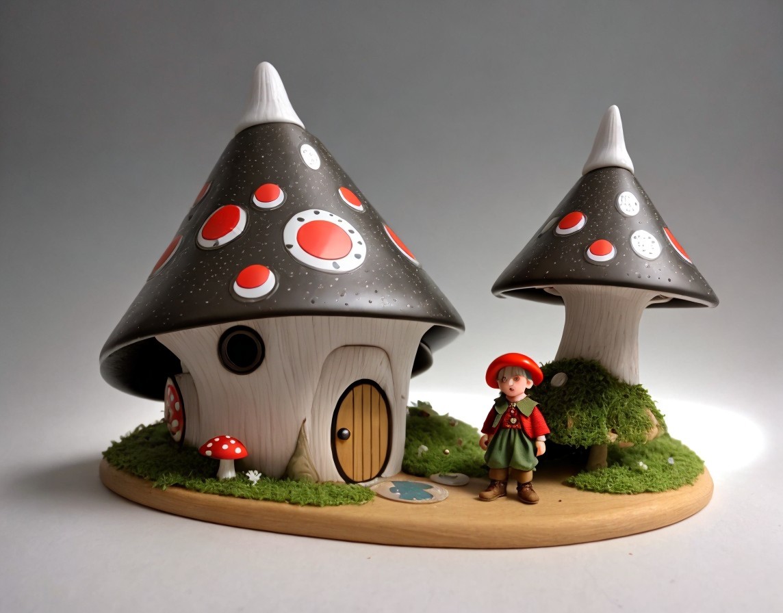 A miniature display featuring two mushroom houses with a small figure standing between them, set on a wooden base with grass and smaller mushrooms.
