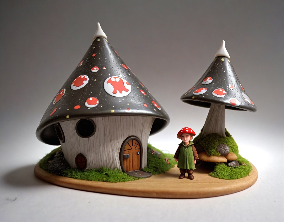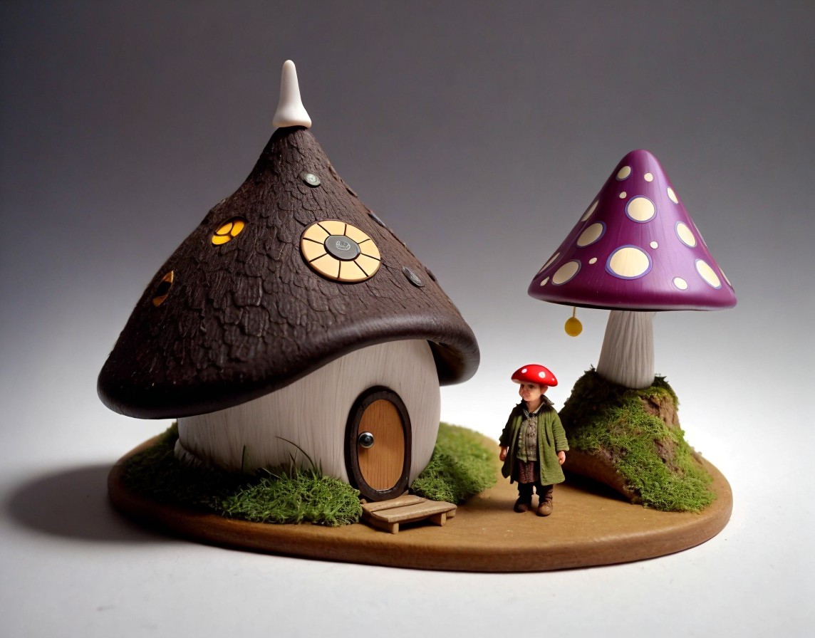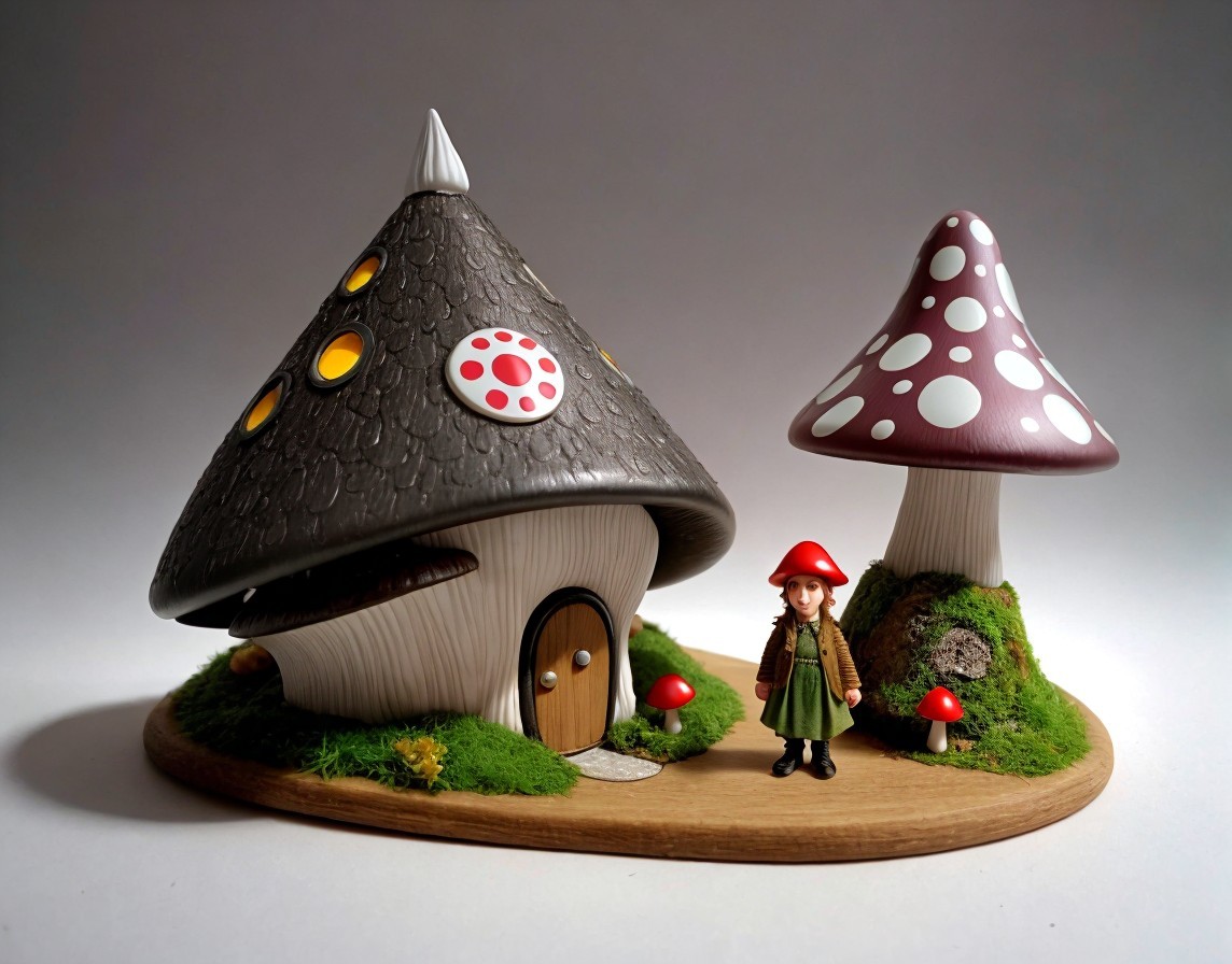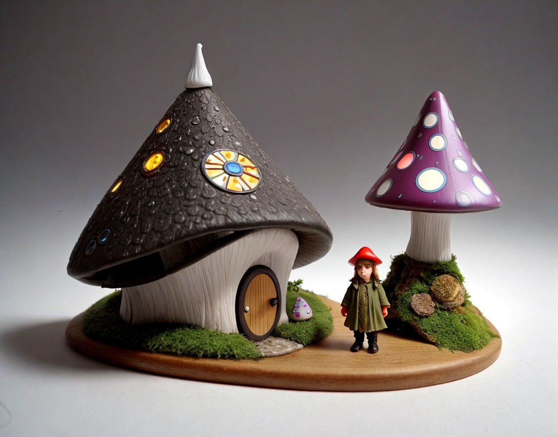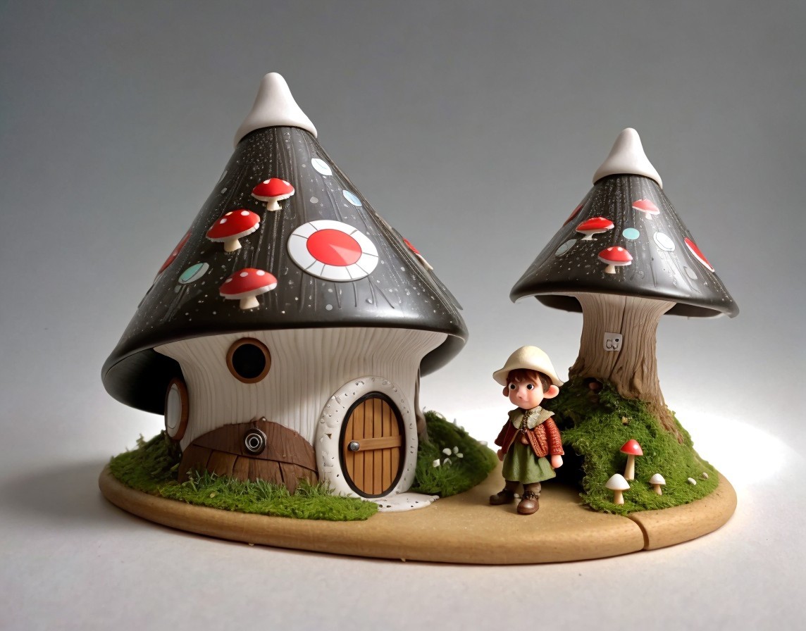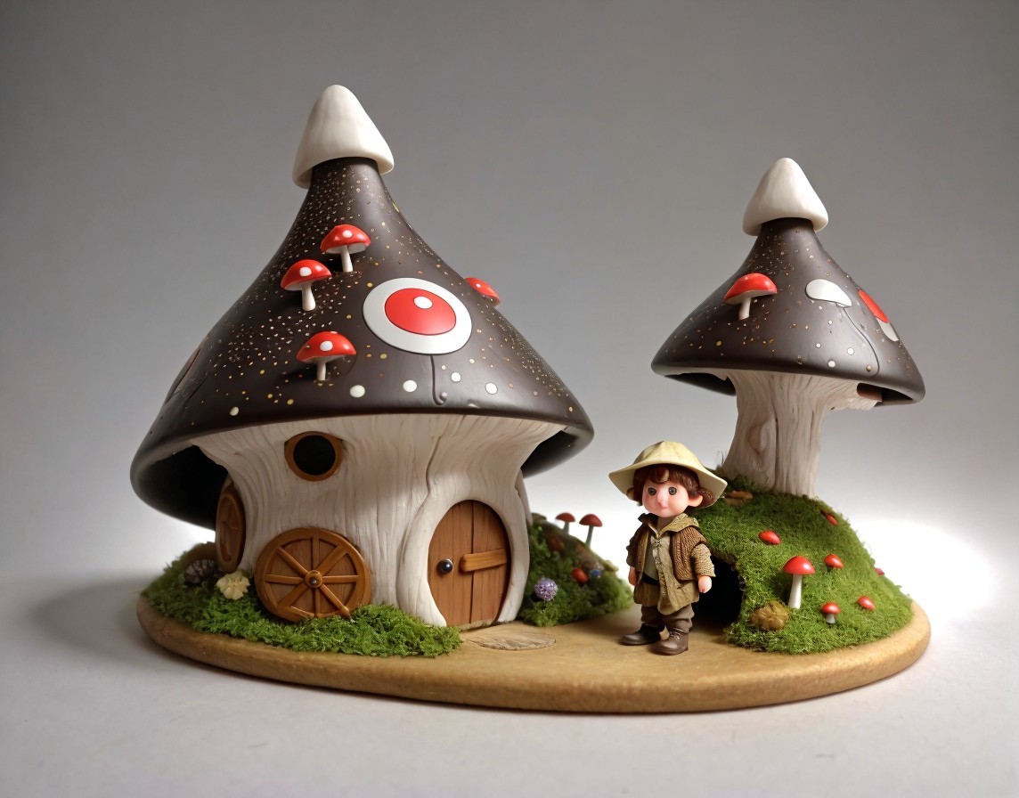 A miniature display featuring two mushroom houses with a small figure standing between them, set on a wooden base with grass and smaller mushrooms.