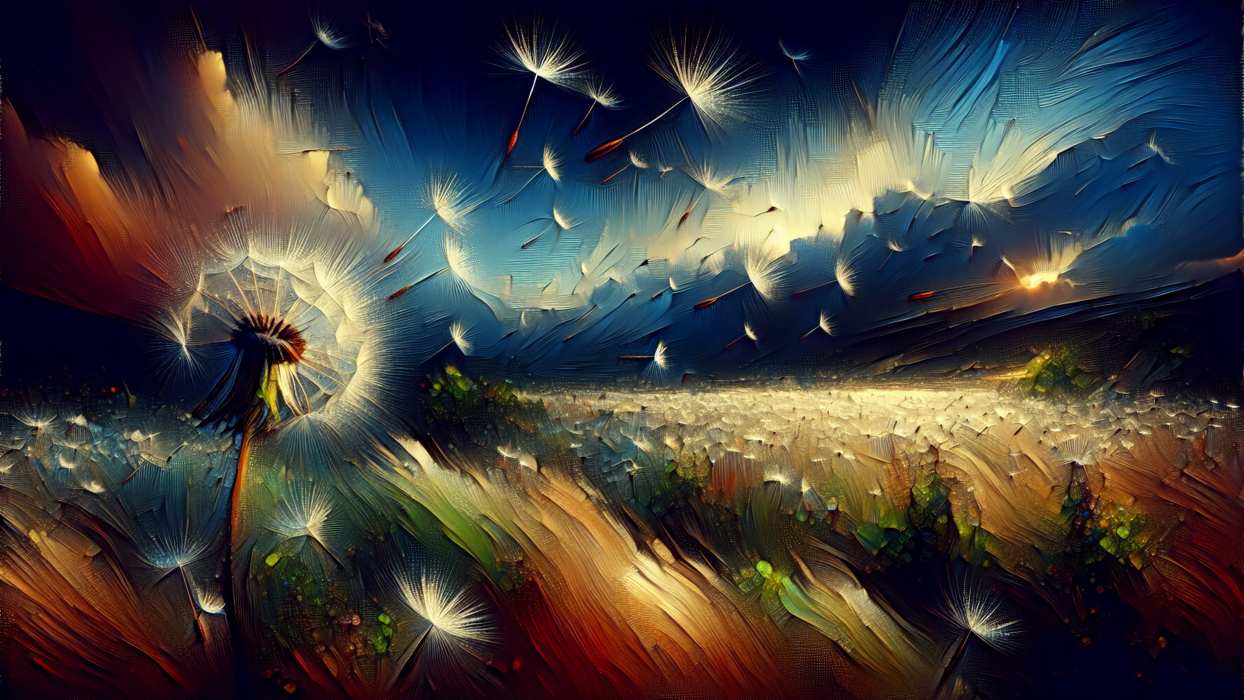 Grateful thanks and huge credit to original dreamer and try-it button, a wonderful inspiration. A vibrant landscape featuring fluffy dandelion flowers swaying in a gentle breeze, set against a dramatic sky with swirling clouds and a warm golden glow in the foreground.
