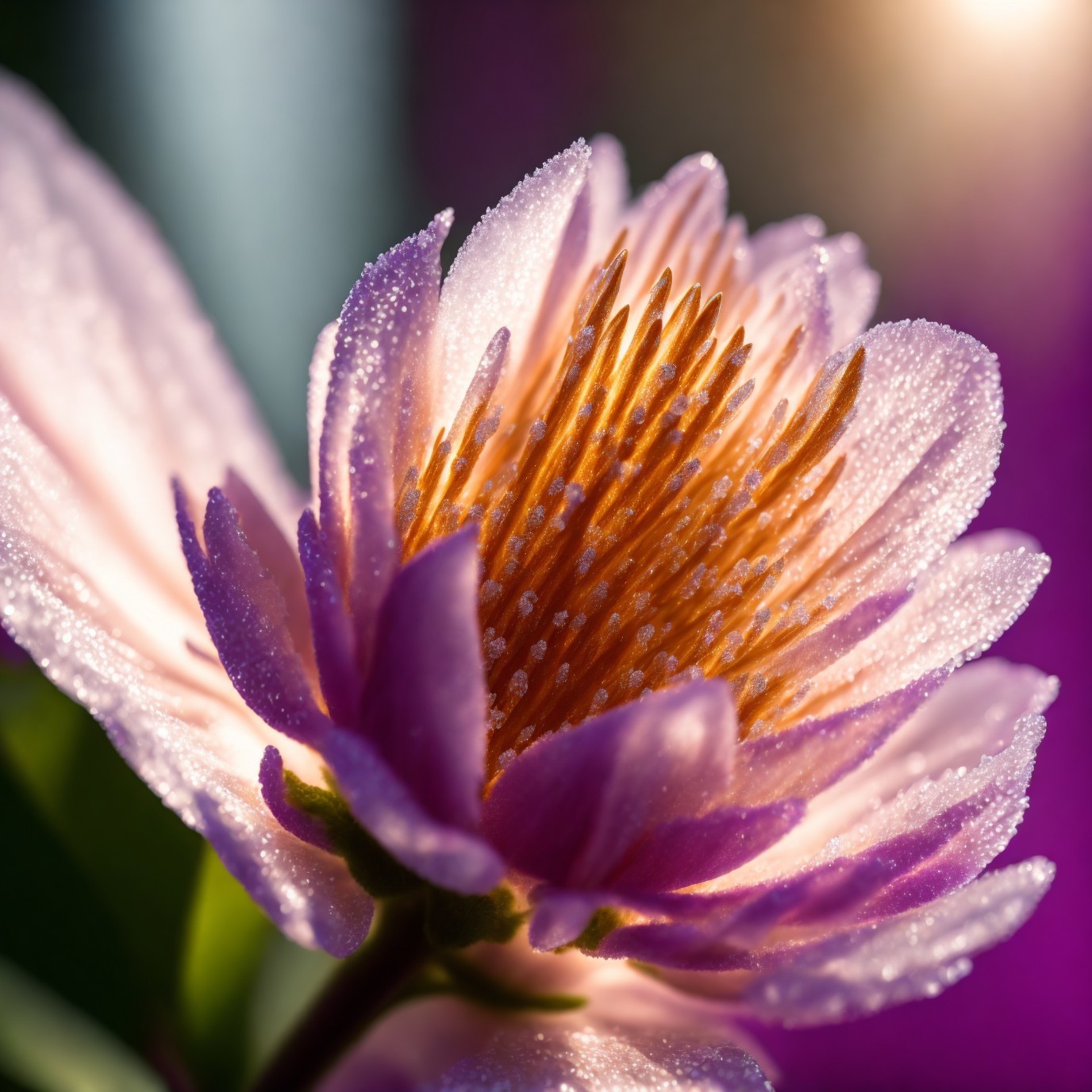 Close-up of a dew-covered flower with a purple hue and golden center, bathed in soft sunlight.