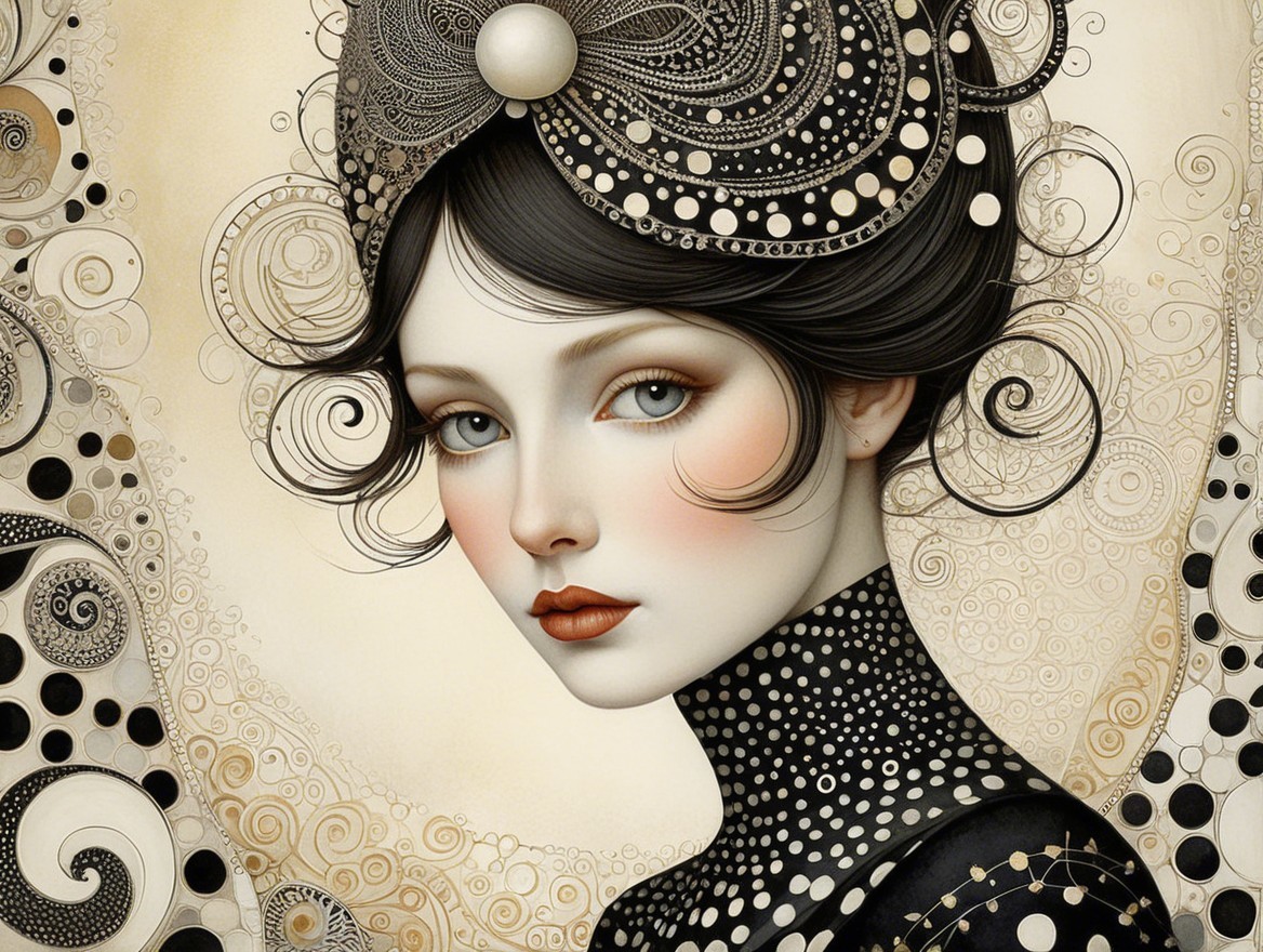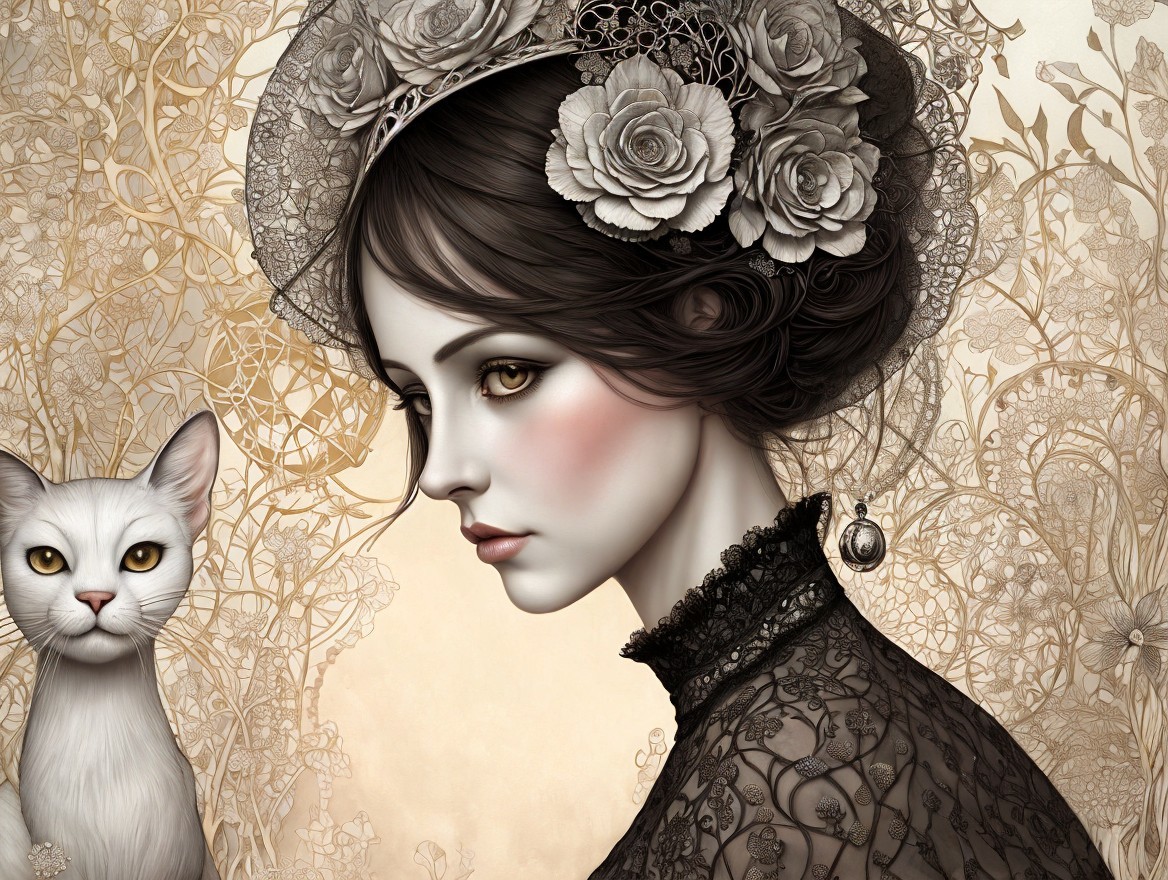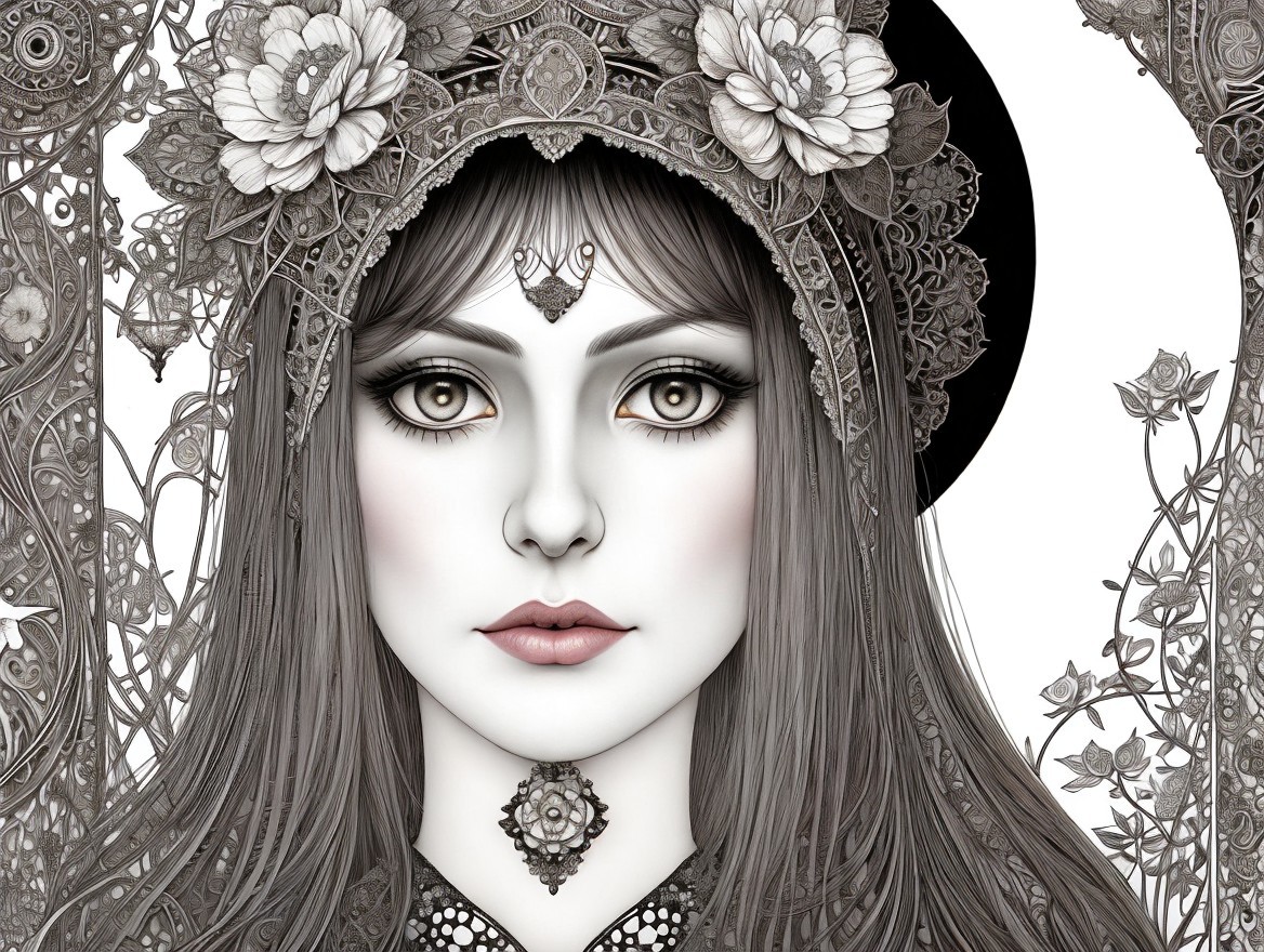 A captivating portrait of a woman adorned with intricate jewelry and a lace headpiece, featuring soft, ethereal features and a serene expression, set against a decorative background.
