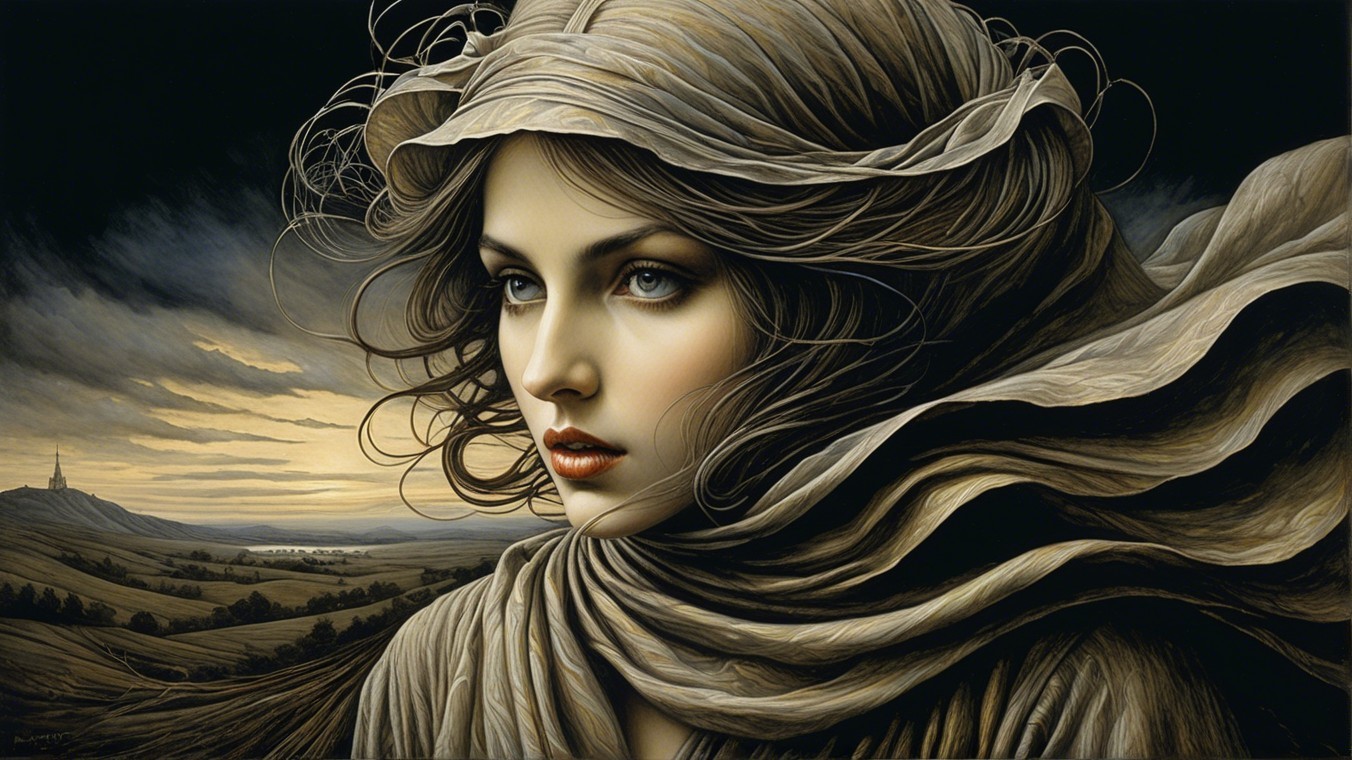 A woman with flowing hair adorned in a golden gown is surrounded by delicate butterflies and swirling leaves, conveying a sense of ethereal beauty and graceful movement in a dark background.