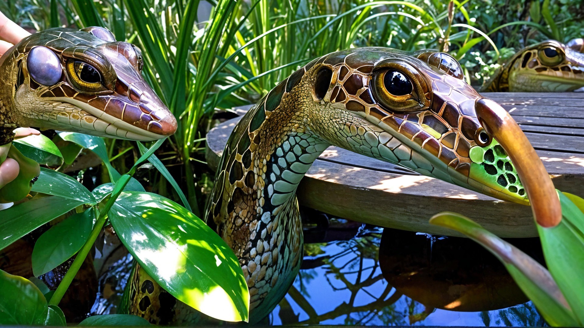 A vibrant snake with intricate patterns rests on a rock in clear water, surrounded by lush green leaves, showcasing its striking color and calm demeanor in a tropical setting.
