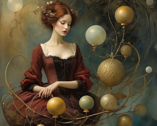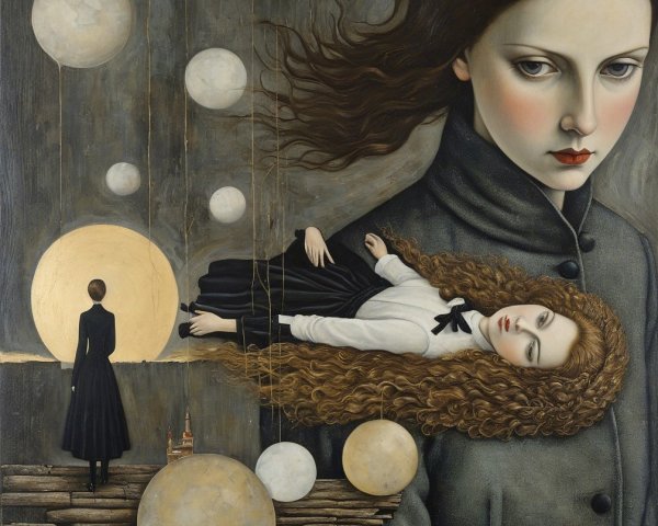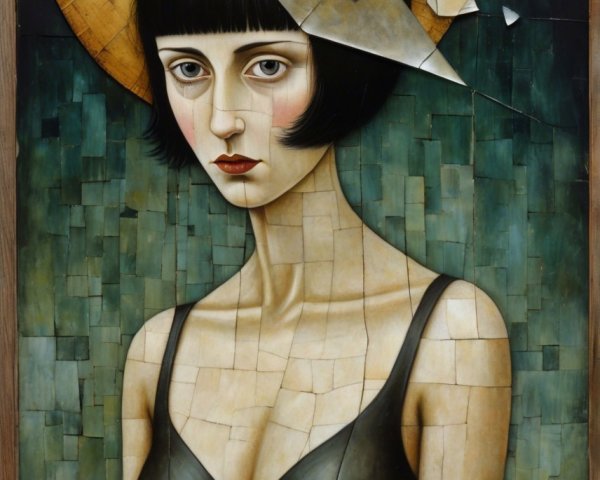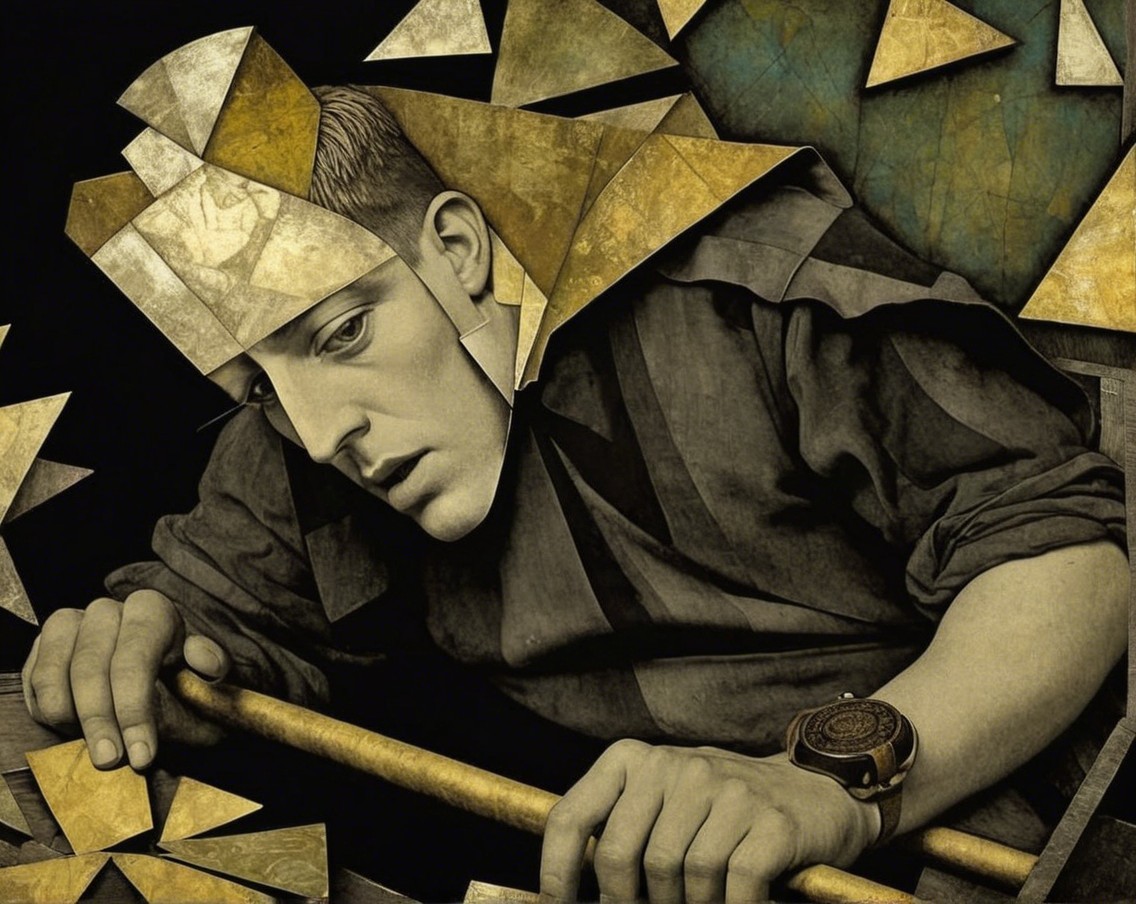 The image features a stylized portrait of a young person with a contemplative expression, holding a flute. The artwork employs geometric shapes and a muted color palette, creating a vintage feel.
