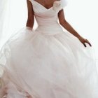 A stunning bridal gown featuring a strapless, sweetheart neckline and a voluminous, flowing skirt. The soft pink fabric is complemented by a delicate flower detail at the waist.