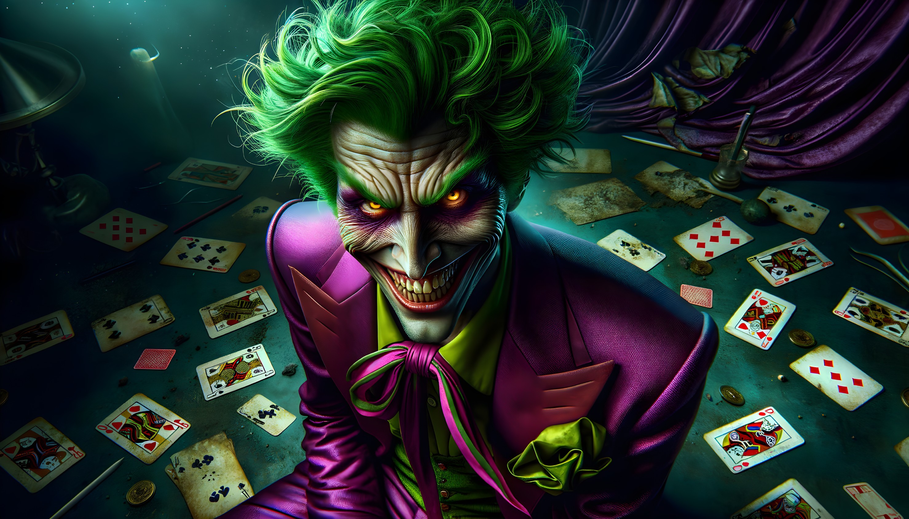 A digital art piece featuring a chaotic joker with a twisted grin, vibrant purple suit, and green hair. Eerie shadows, playing cards, and a gritty atmosphere add to the surreal setting. The intense expression and dramatic lighting enhance the intricate facial features and exaggerated emotions. The artwork is detailed, textured, and inspired by Heath Ledger's portrayal, showcased