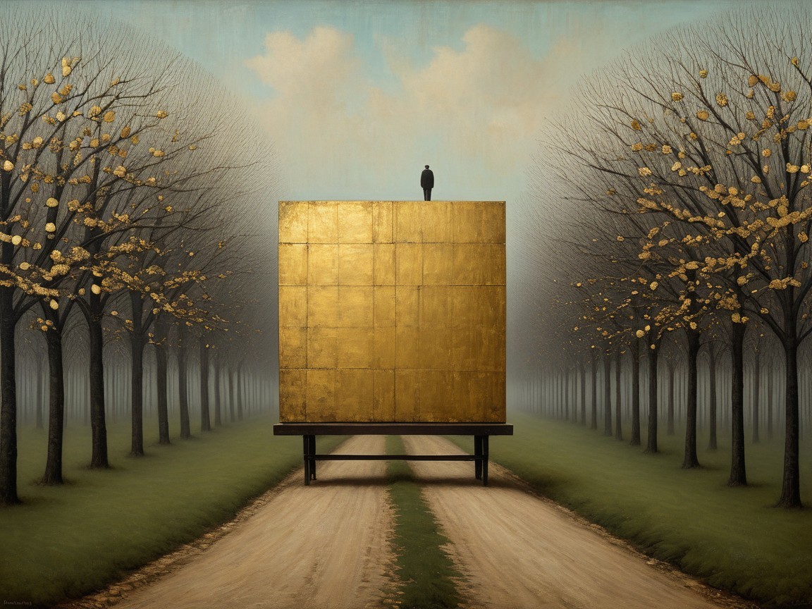 A surrealistic painting depicts a tall, massive golden rectangular block with a solitary man standing on its top, set within a dreamlike landscape. The golden block, which appears to be a solid wall or structure made of segmented golden panels, is placed on a dark, elongated platform resembling a bench Original Prompt: deb eh