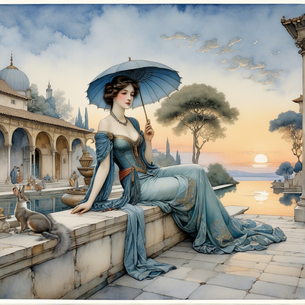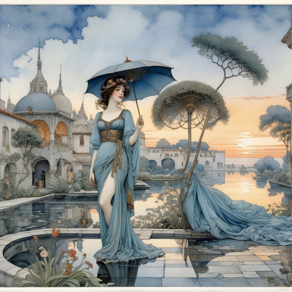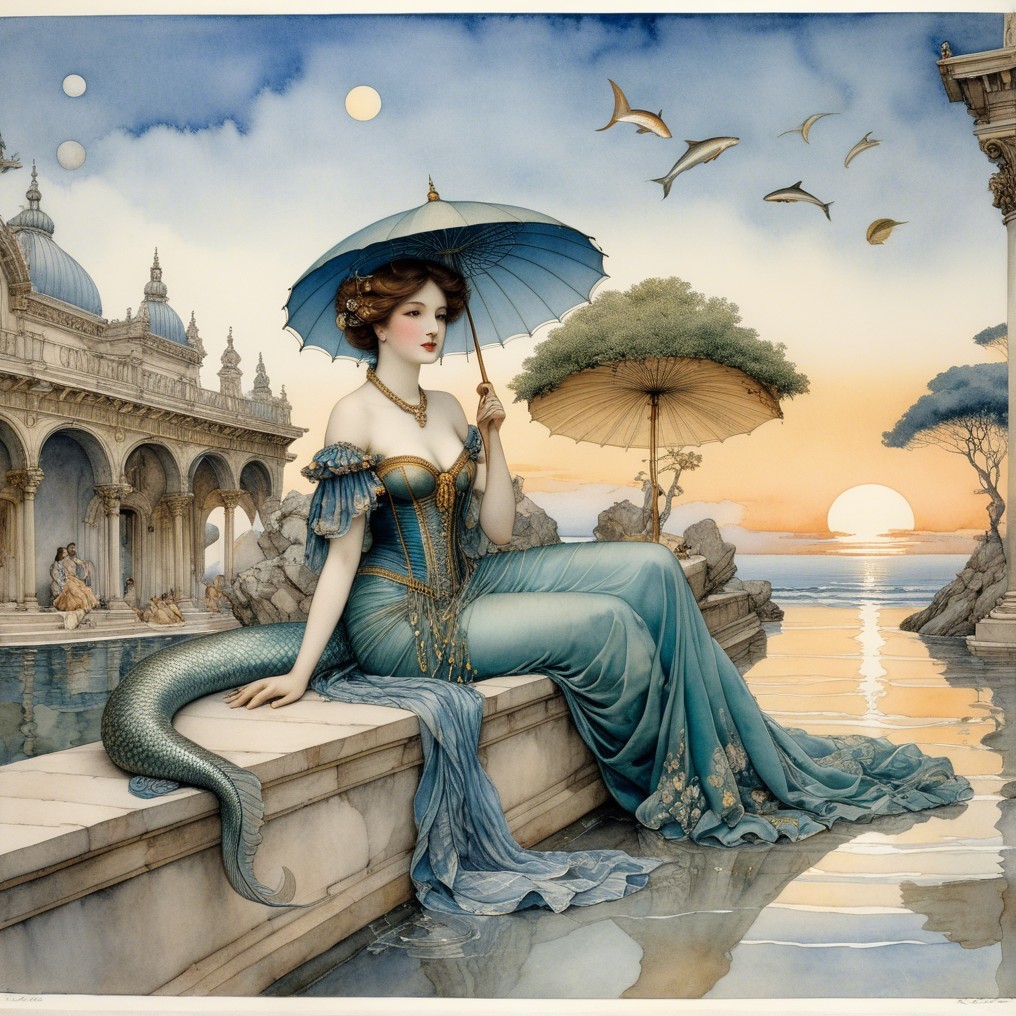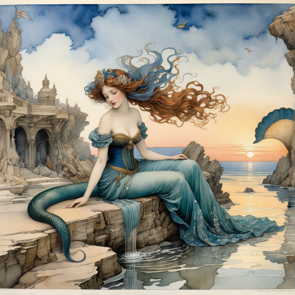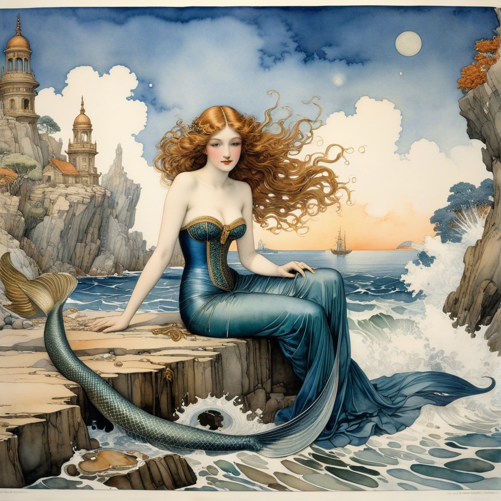 A serene woman with flowing red hair sits by the ocean, wearing a stunning blue dress. The backdrop features a peaceful landscape with trees, a house, and a glowing sunset under a full moon.