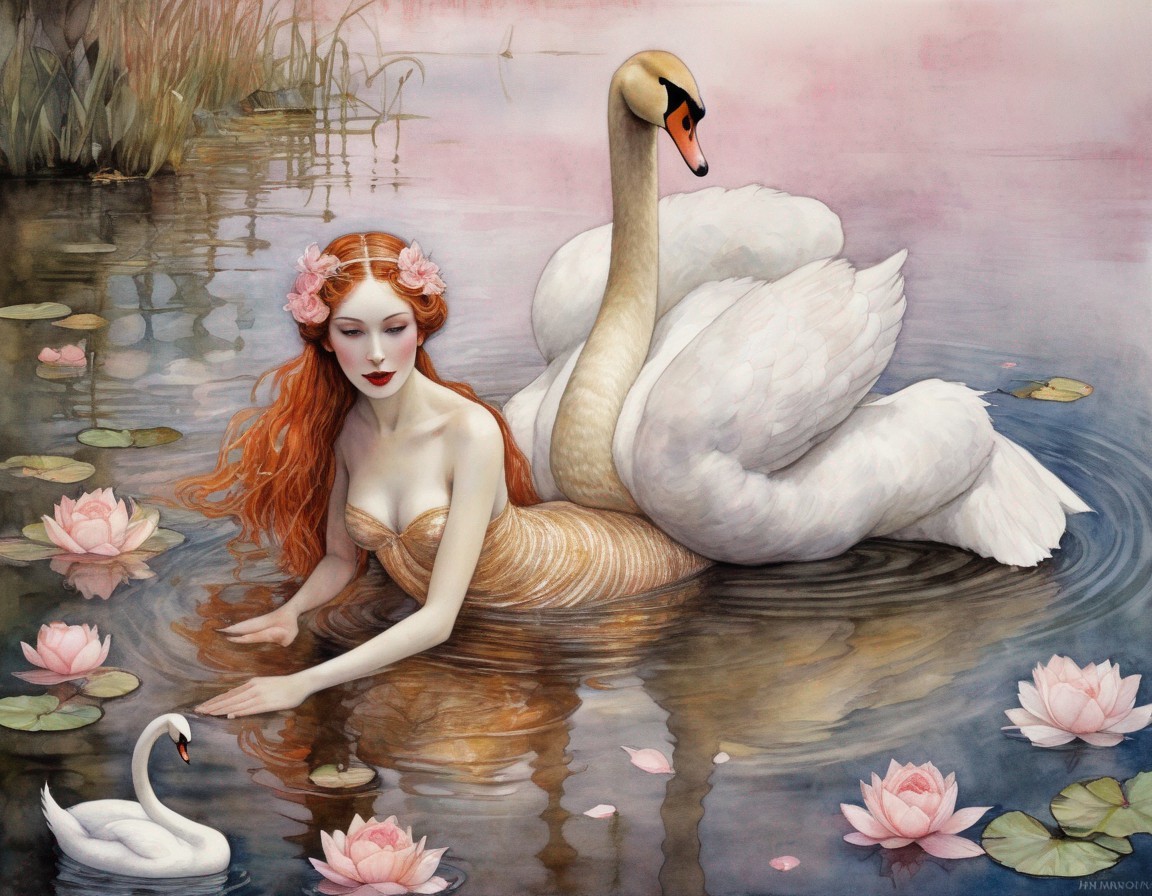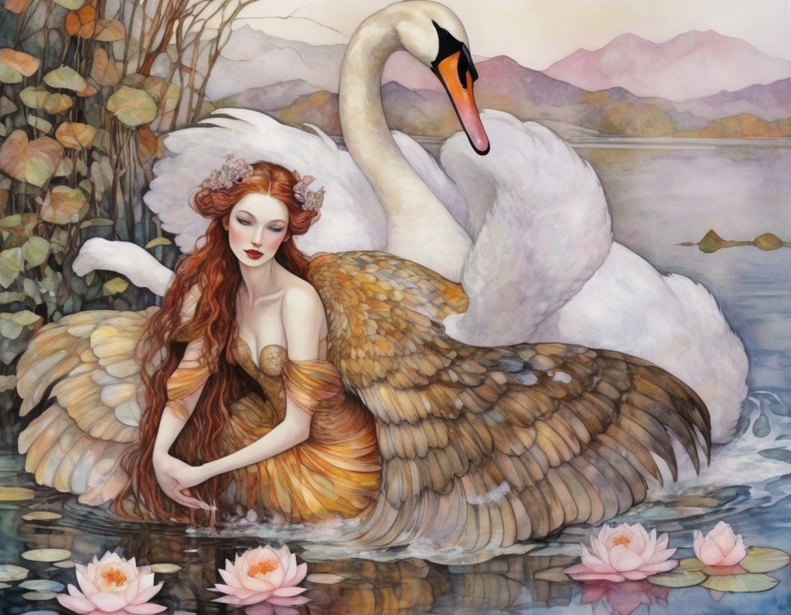 + Prompt:A full colored painting of a beautiful nymph swan woman with her swan emerging from the lake, whimsical, beautiful, poignant, colors rose, gold, white pink, black.