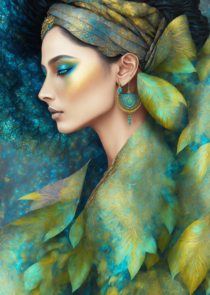 A woman with striking makeup wearing a gold-embellished blue headscarf and matching earrings, exuding elegance and exotic beauty.