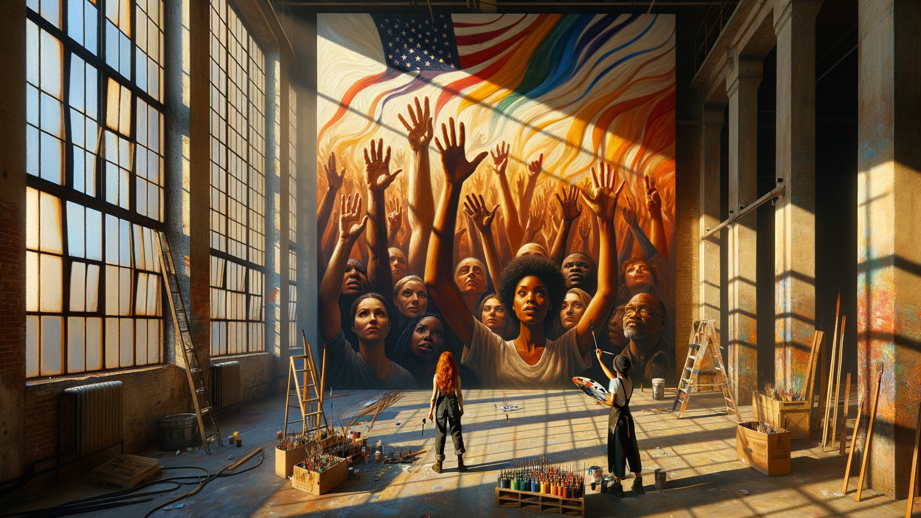 In a sunlit warehouse, two artists stand before a vibrant mural depicting diverse faces with raised hands, symbolizing unity and resilience. Ladders and paint supplies surround them, enhancing creativity.