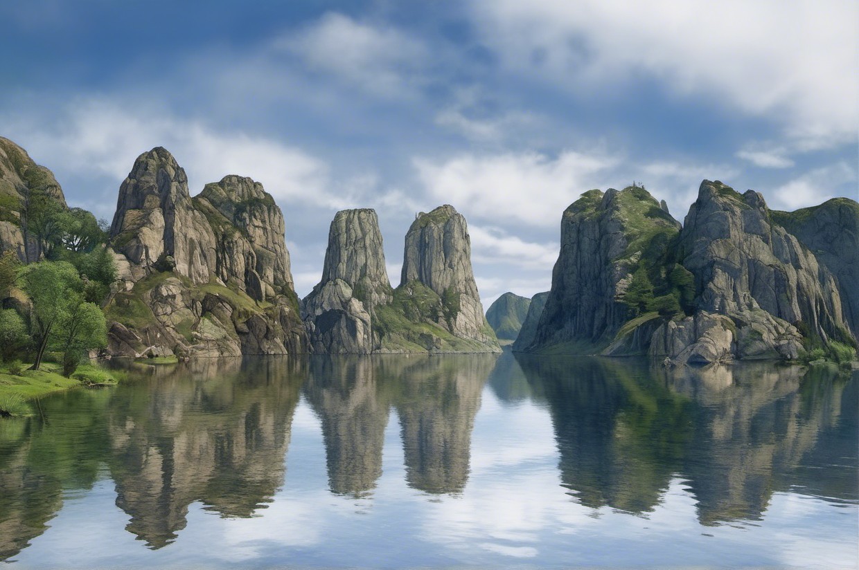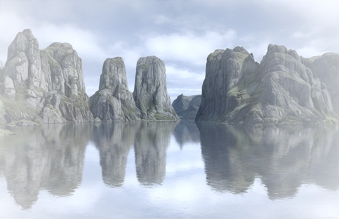 The image features towering rocky formations rising from a calm body of water, with their reflections mirrored on the surface, set against a soft, muted sky.