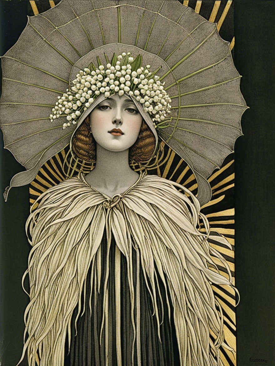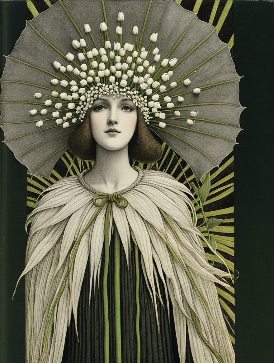 A serene figure adorned with large, stylized petals and a crown resembling flowers. The intricate design blends natural elements with a graceful, ethereal presence against a dark background.