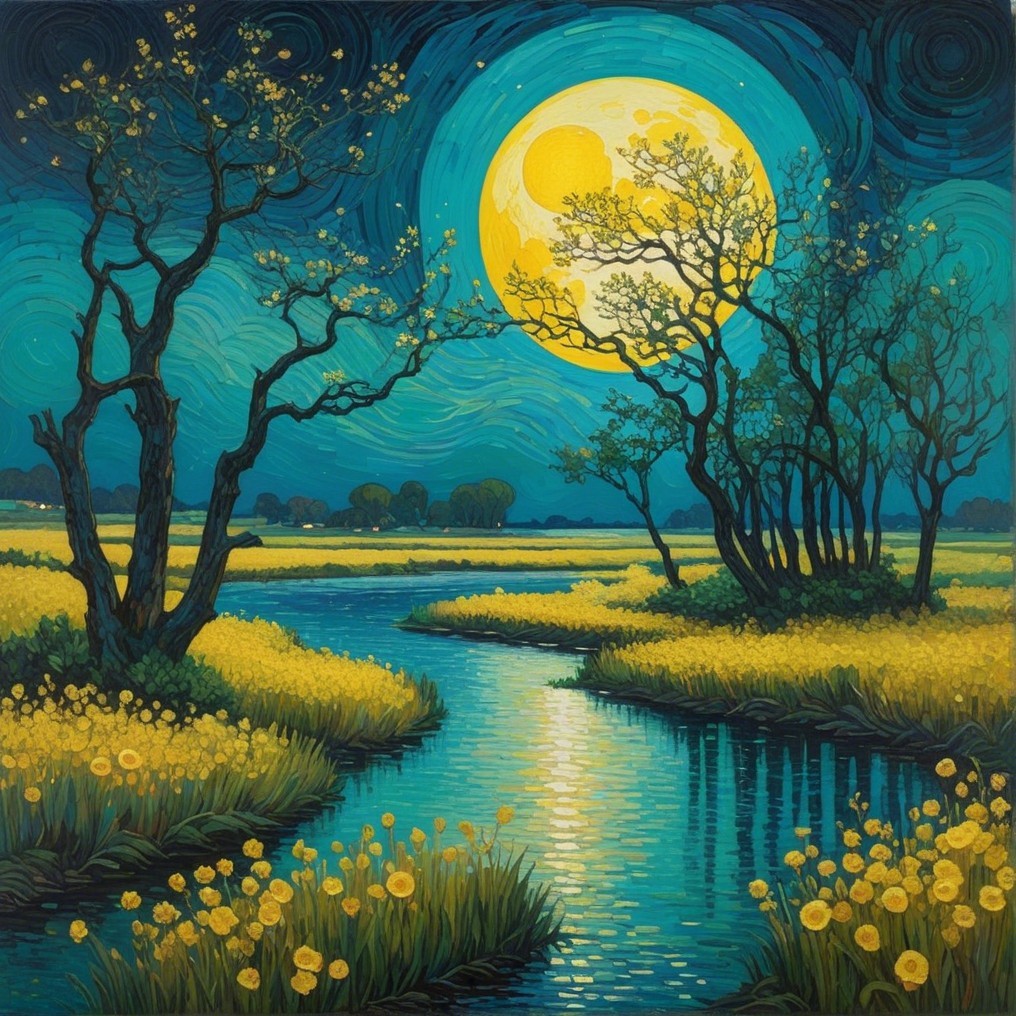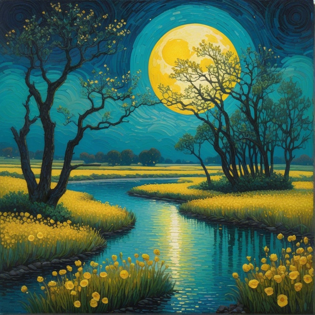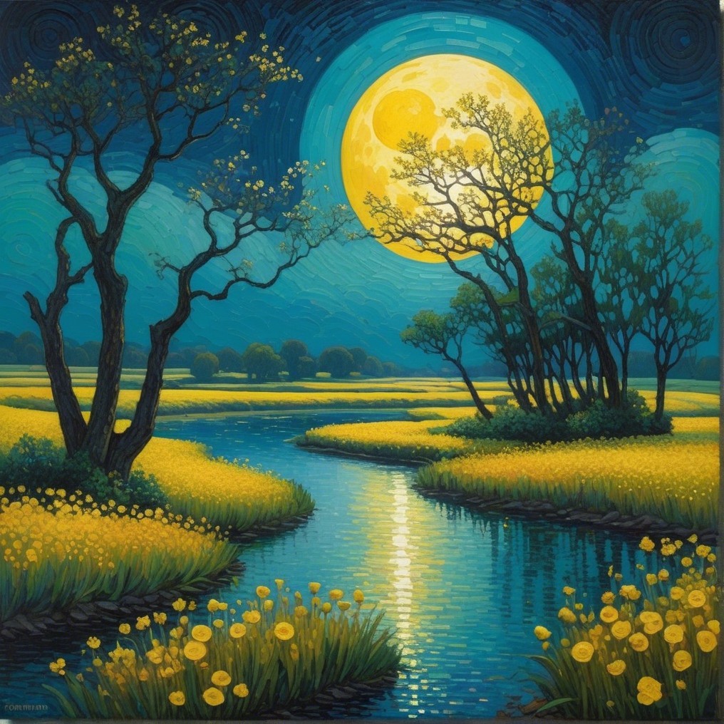 A peaceful landscape under the light of a full moon. Fields of yellow flowers glow in the moonlight, while a calm river winds through the scene, reflecting the celestial glow. The composition blends vivid colors and dynamic textures to create a harmonious, dreamlike atmosphere.