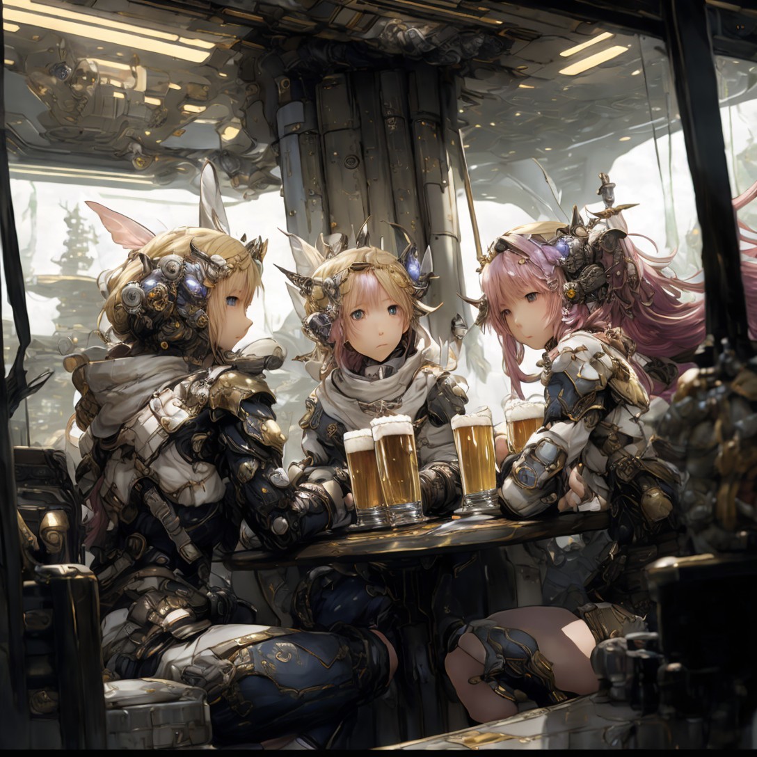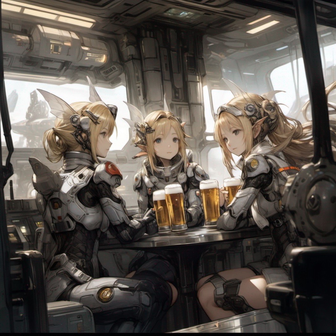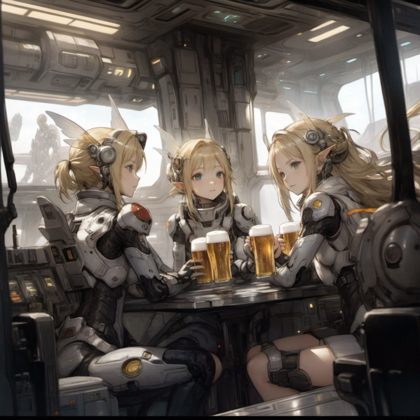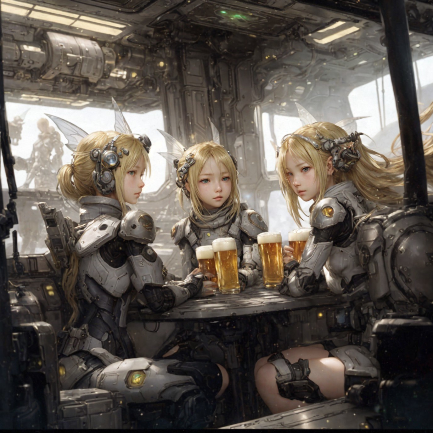 Robotic Figures in Futuristic Metallic Setting with Beer