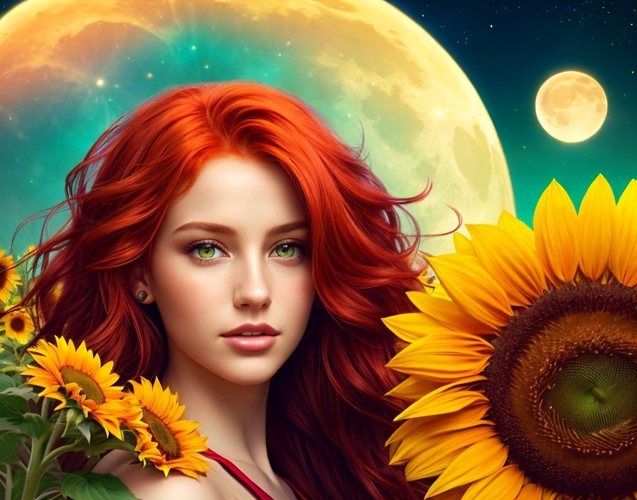 Vibrant red hair woman portrait with sunflowers and moon in cosmic setting