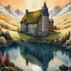 Two Dalmatian dogs are depicted in a serene autumn landscape, surrounded by mountains and a tranquil lake. Vibrant orange foliage contrasts with the serene blue waters, creating a peaceful scene.