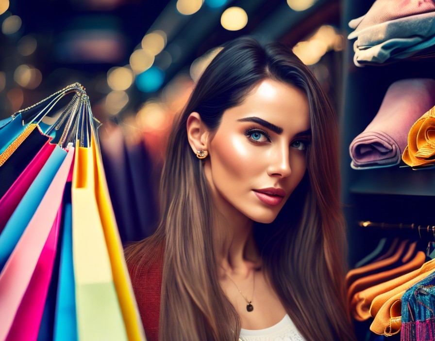 Group of joyous women laden with colorful shopping bags, chatting and enjoying a bustling day out.