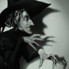 A creepy witch with exaggerated facial features and long, sharp fingers casts a menacing shadow. She's dressed in dark clothing and wears a tall, pointed hat, enhancing her sinister appearance.