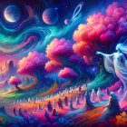 A vibrant, surreal landscape features a colorful sky filled with swirling patterns. In a mystical valley, a figure in a flowing dress stands amidst pink trees and whimsical hills, with gentle creatures nearby.