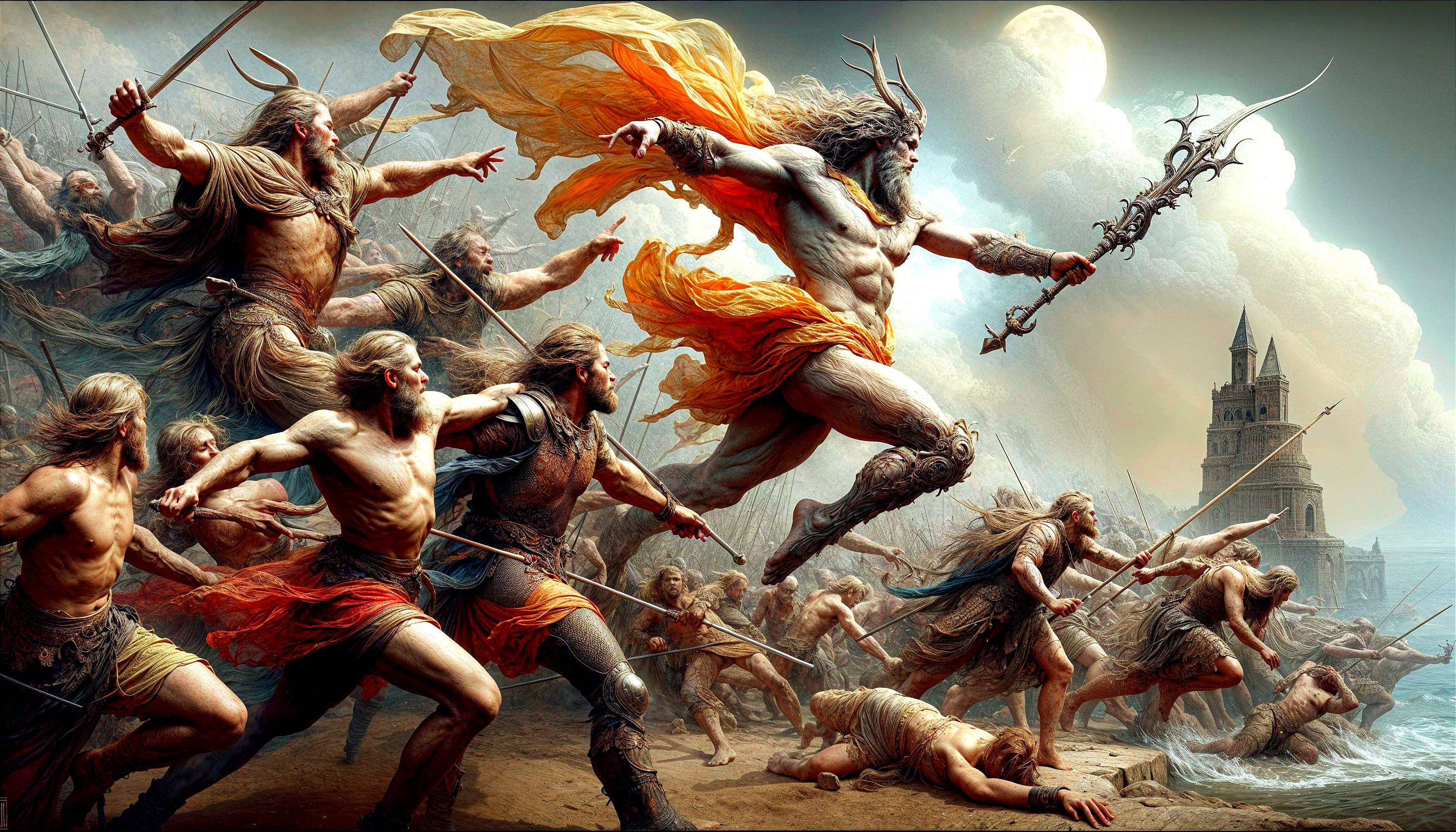 A dynamic scene of mythic warriors charging into battle, with a powerful figure in orange and gold leading, wielding a spear, against a dramatic sky and distant castle.
