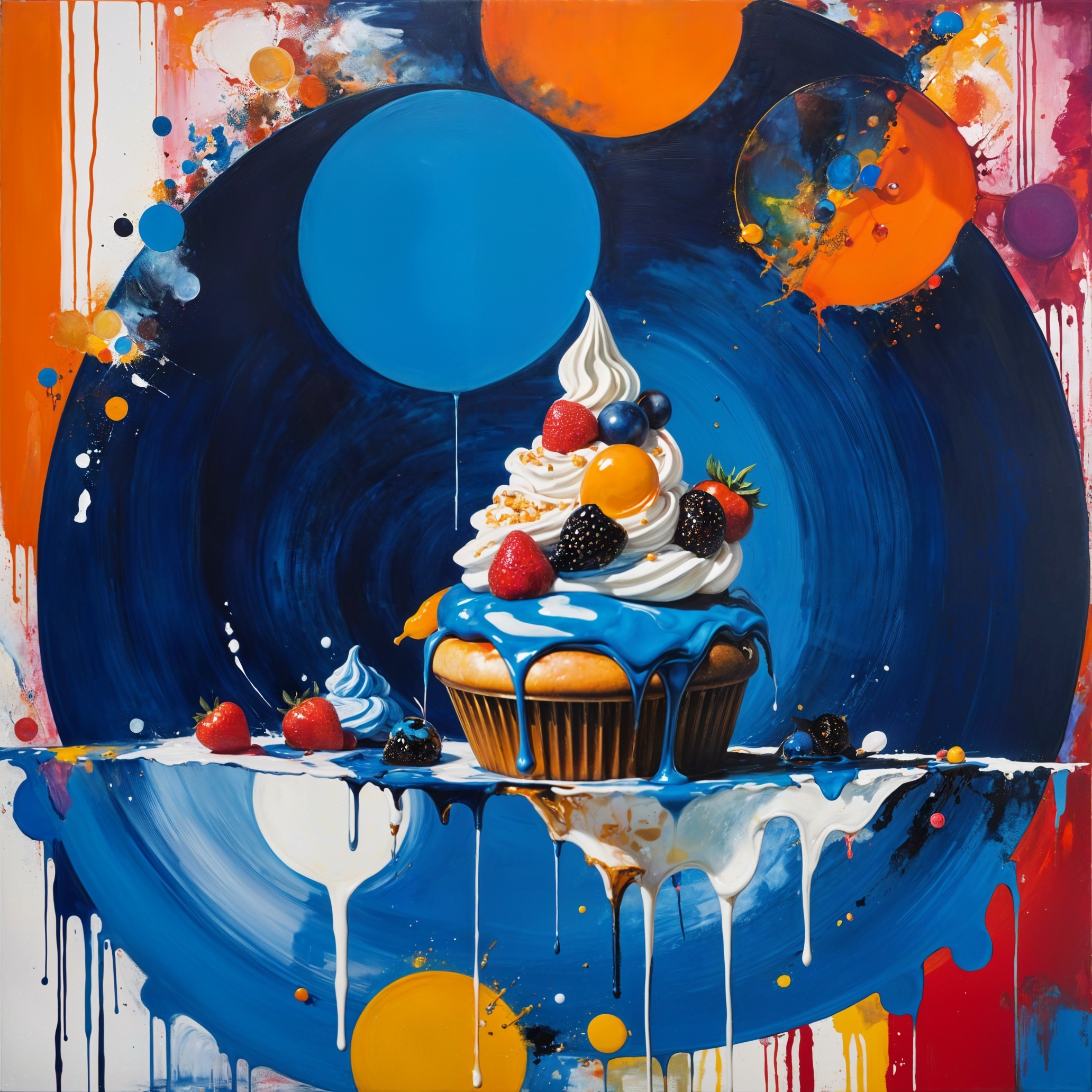 A vibrant, abstract painting featuring a large cupcake topped with swirling blue frosting and fresh berries, set against a vivid backdrop of colorful circles and splashes.