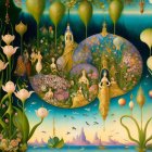 A vibrant, surreal scene features tree-like structures intertwined with decorative elements, blossoms, and serene figures sitting peacefully, all set against a serene night sky.