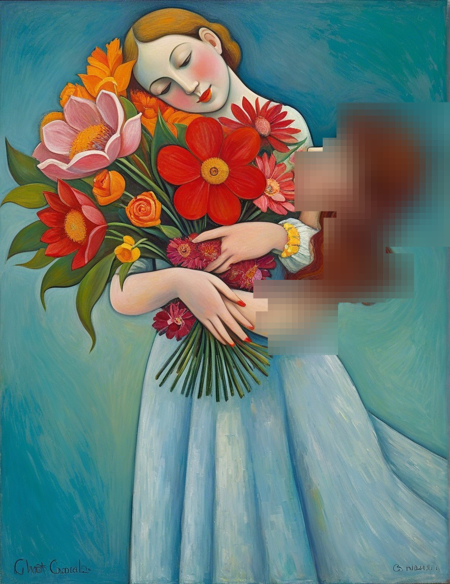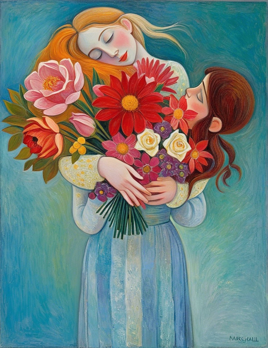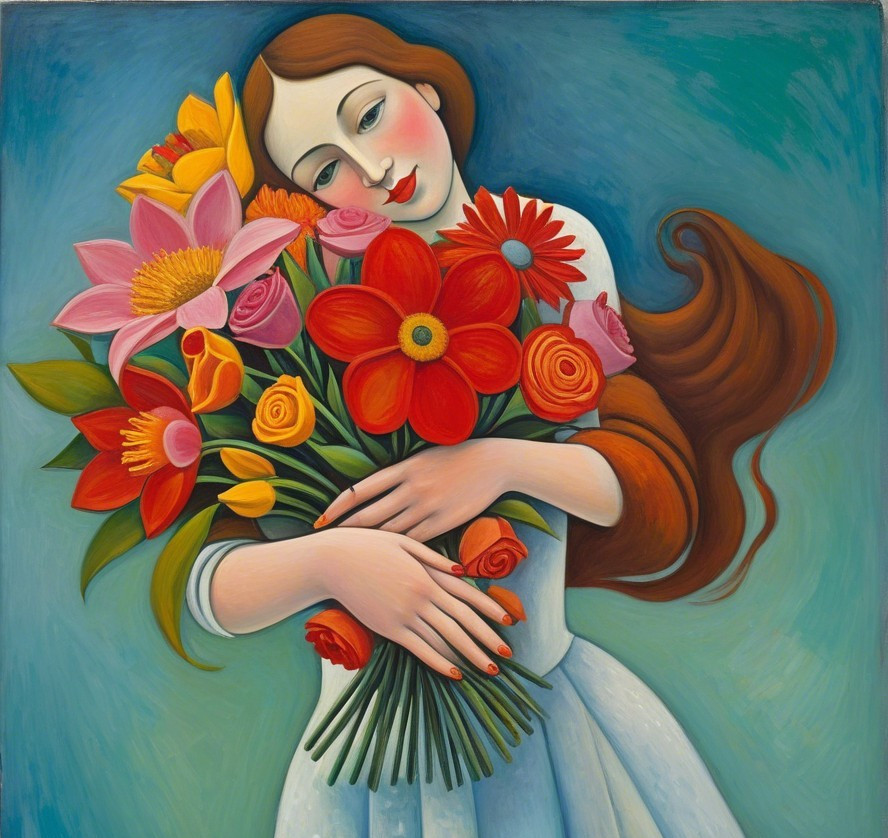 A woman with flowing hair embraces a vibrant bouquet of flowers, featuring reds, yellows, and pinks. The background is a blend of soft blues and geometric shapes, adding to the dreamlike feel.