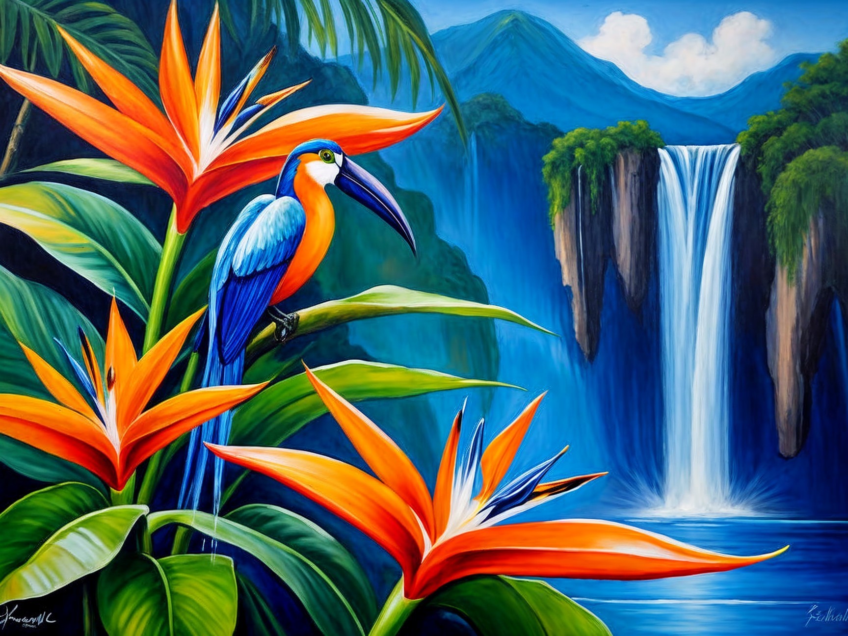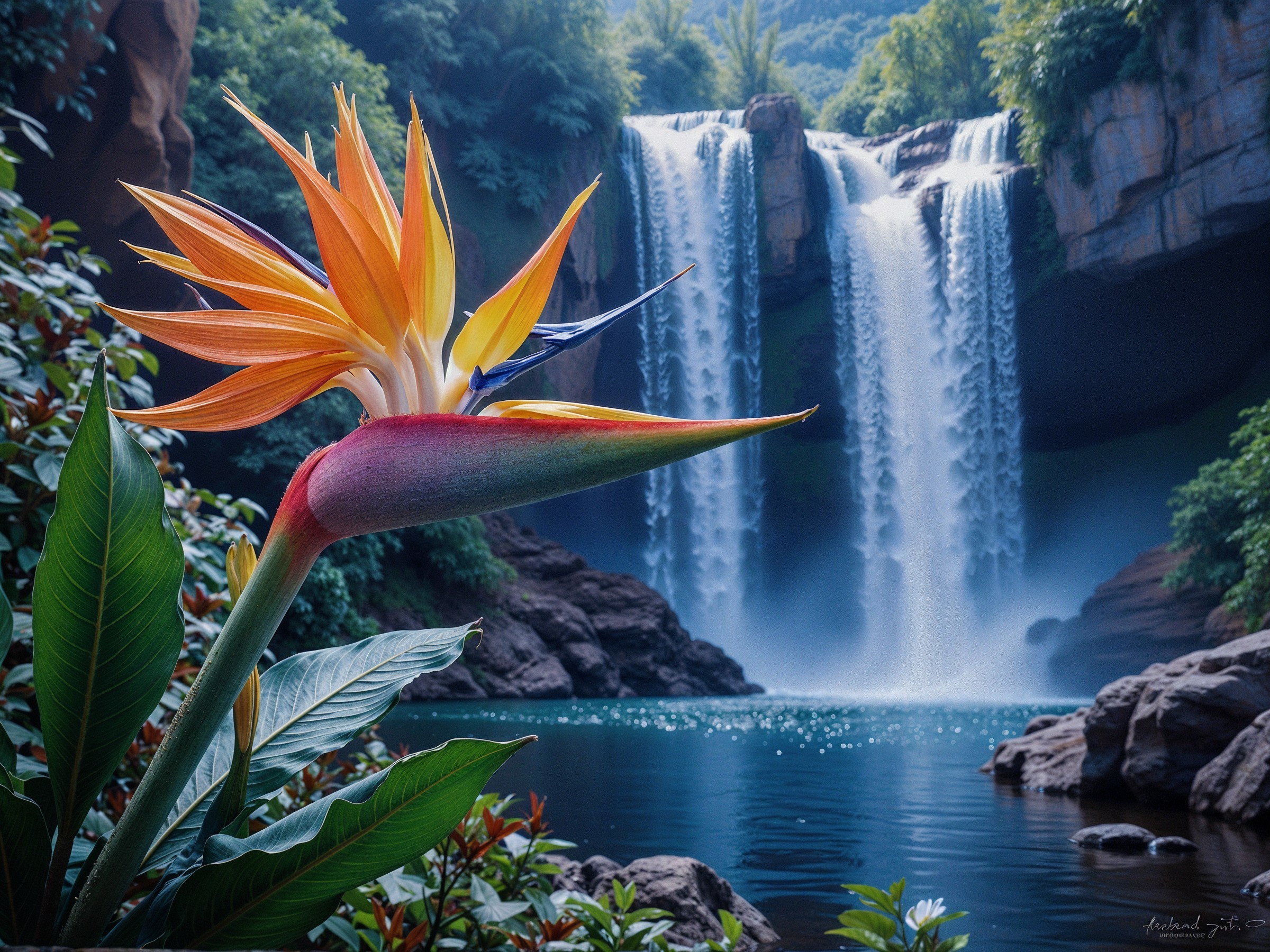 A vibrant kingfisher perches amid lush, colorful tropical flowers, overlooking a serene, sparkling lake with cascading waterfalls in a breathtaking jungle setting.
